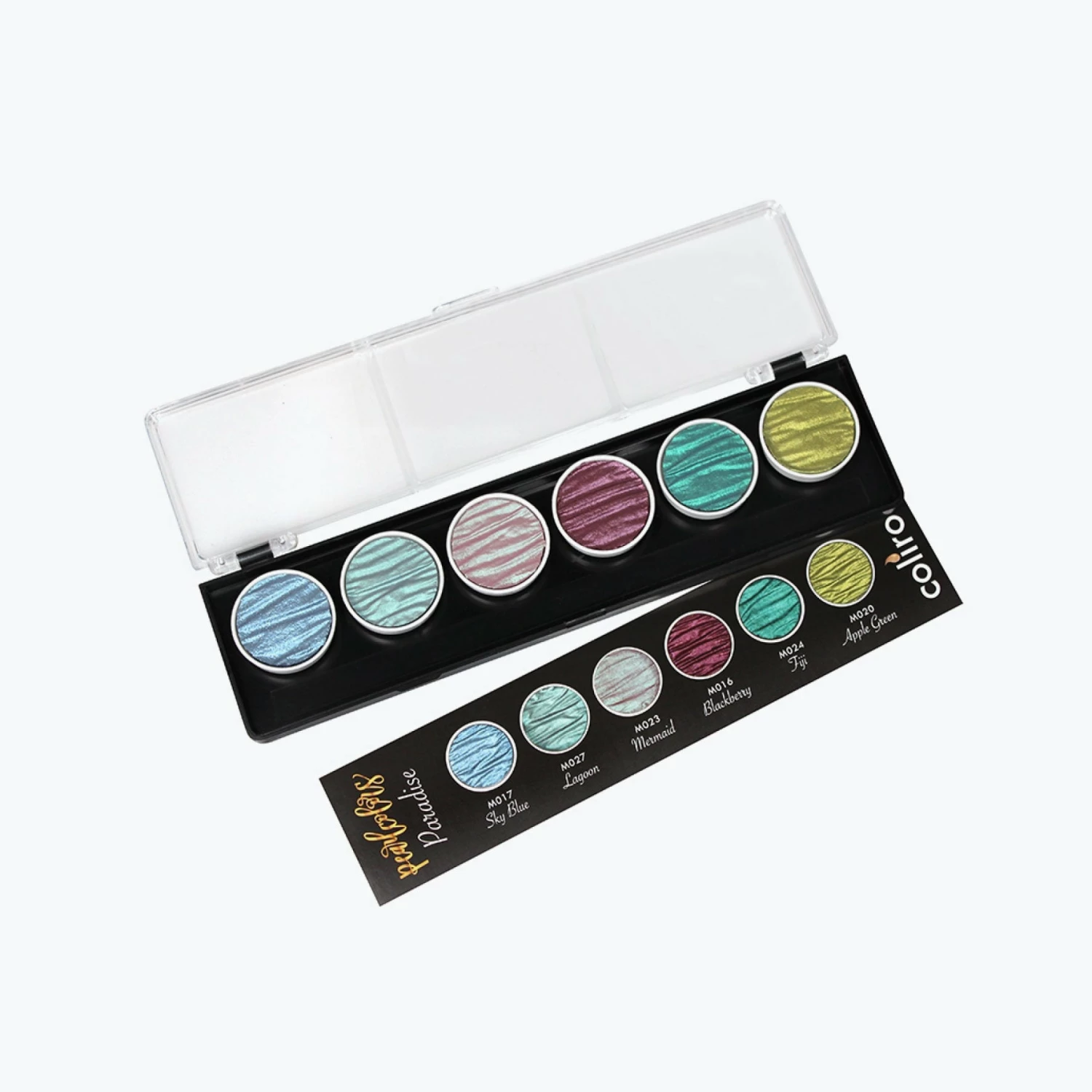 6 Pearlcolors Γ 30 mm in a plastic box. Colour pans can be exchanged.