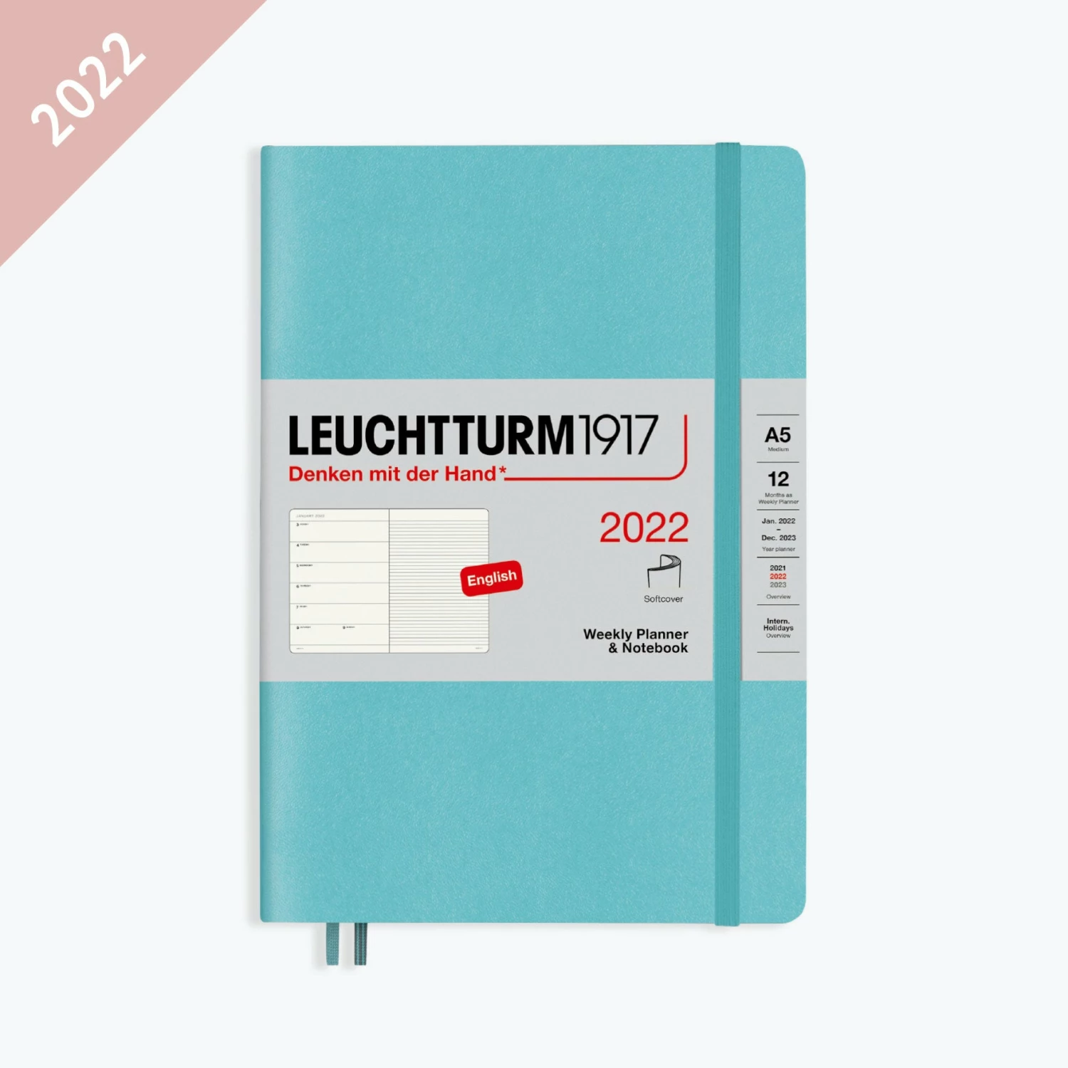 The A5Β aquamarine blueΒ Leuchtturm1917Β weeklyΒ notebookΒ diary is a simple yet functionalΒ companion for 2022.Β Every page features the calendar week on the left and a ruled notebook page on the right.Β
