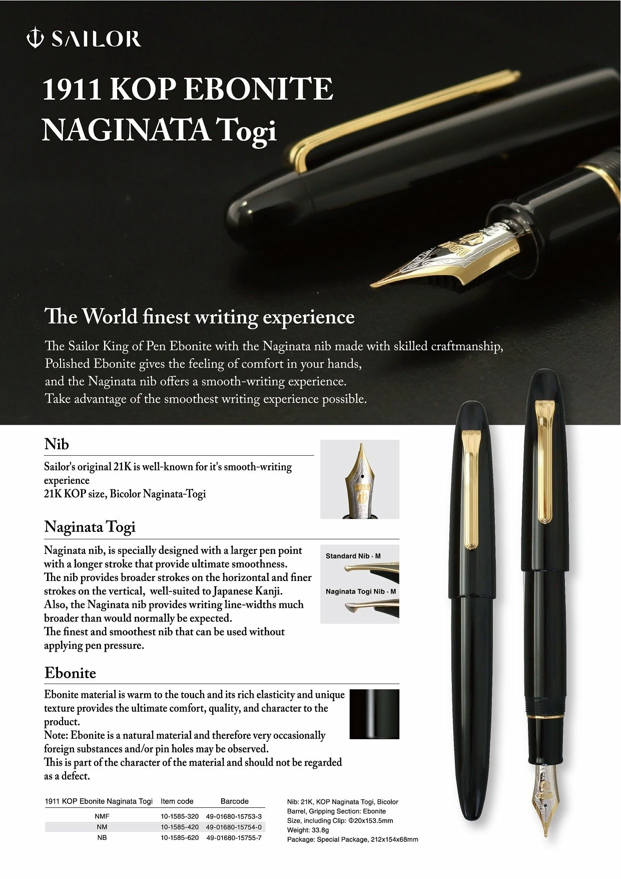 The Sailor King of Pen Black Ebonite with gold trim is a study in streamlined style and simplicity. Handcrafted ebonite hard rubber and Sailor 21k nibs combine to create a unique andΒ truelyΒ beautiful pen. Now this classic pen is available with a 21k two-tone Naginata Togi nib.
