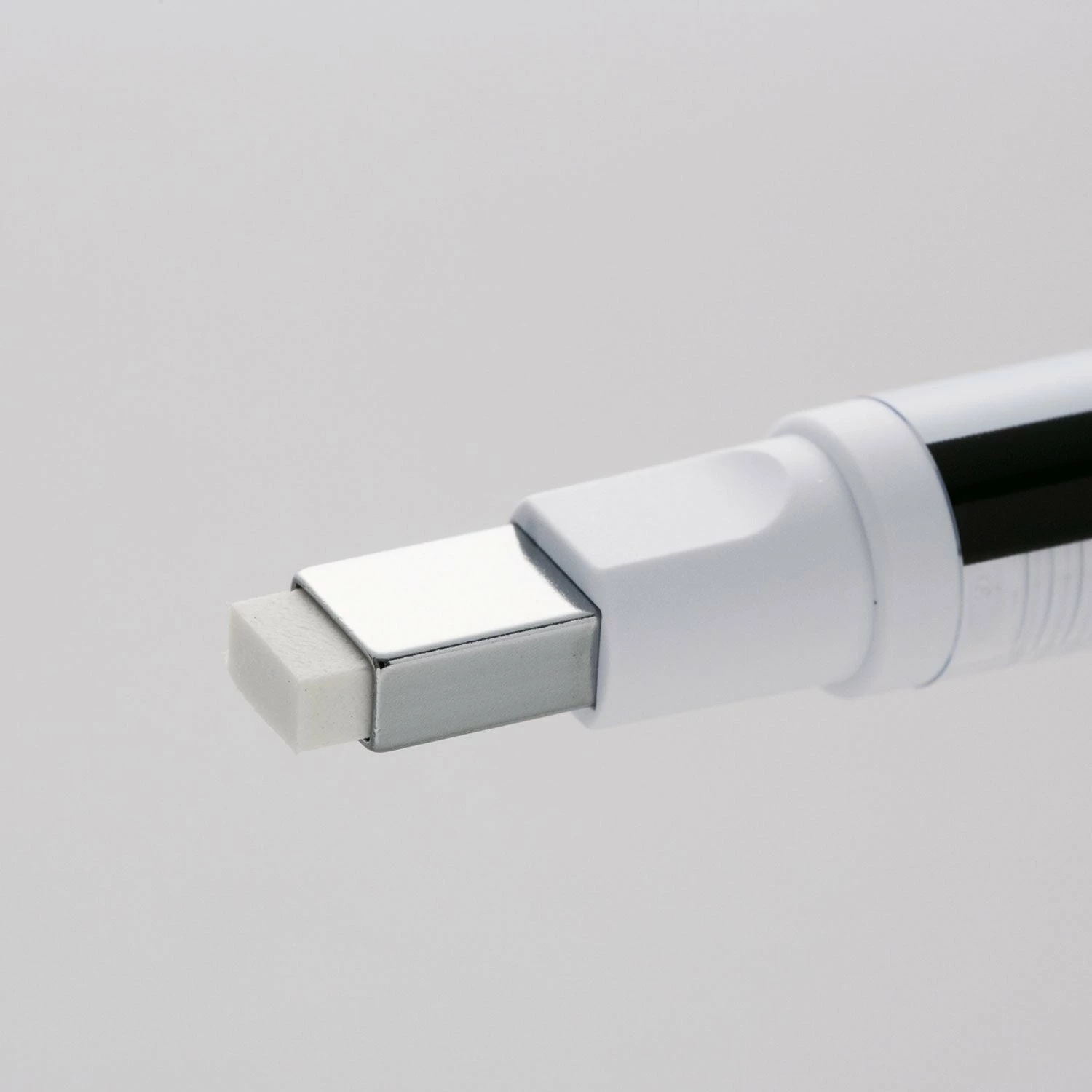 The unique indirect chucking system extends the eraser by only 0.7 mm with each push. To refill the eraser, push and hold the knock button on the main body and insert the eraser with the plastic stick from the tip of the sleeve.