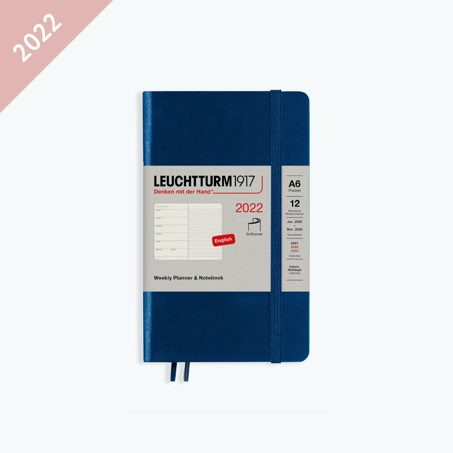 The A6 navy Leuchtturm1917 weekly notebook diary is a simple yet functional companion for 2022. Every page features the calendar week on the left and a ruled notebook page on the right.