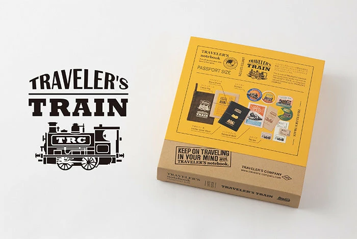 Enjoy the journey of your imagination with this limited design Travelerβs Notebook Train set. TheΒ black,Β passportΒ sizeΒ Travelerβs notebook is foil-stamped with the logo of the Travelerβs train, while the cover of the blank refill isΒ inspired byΒ a steam locomotives. The set also includes a brass,Β trainΒ charm that can be attached to the elastic of the notebook, stickers and stamps for customising the notebook, and a cotton bag that can be used as a storage pouch.