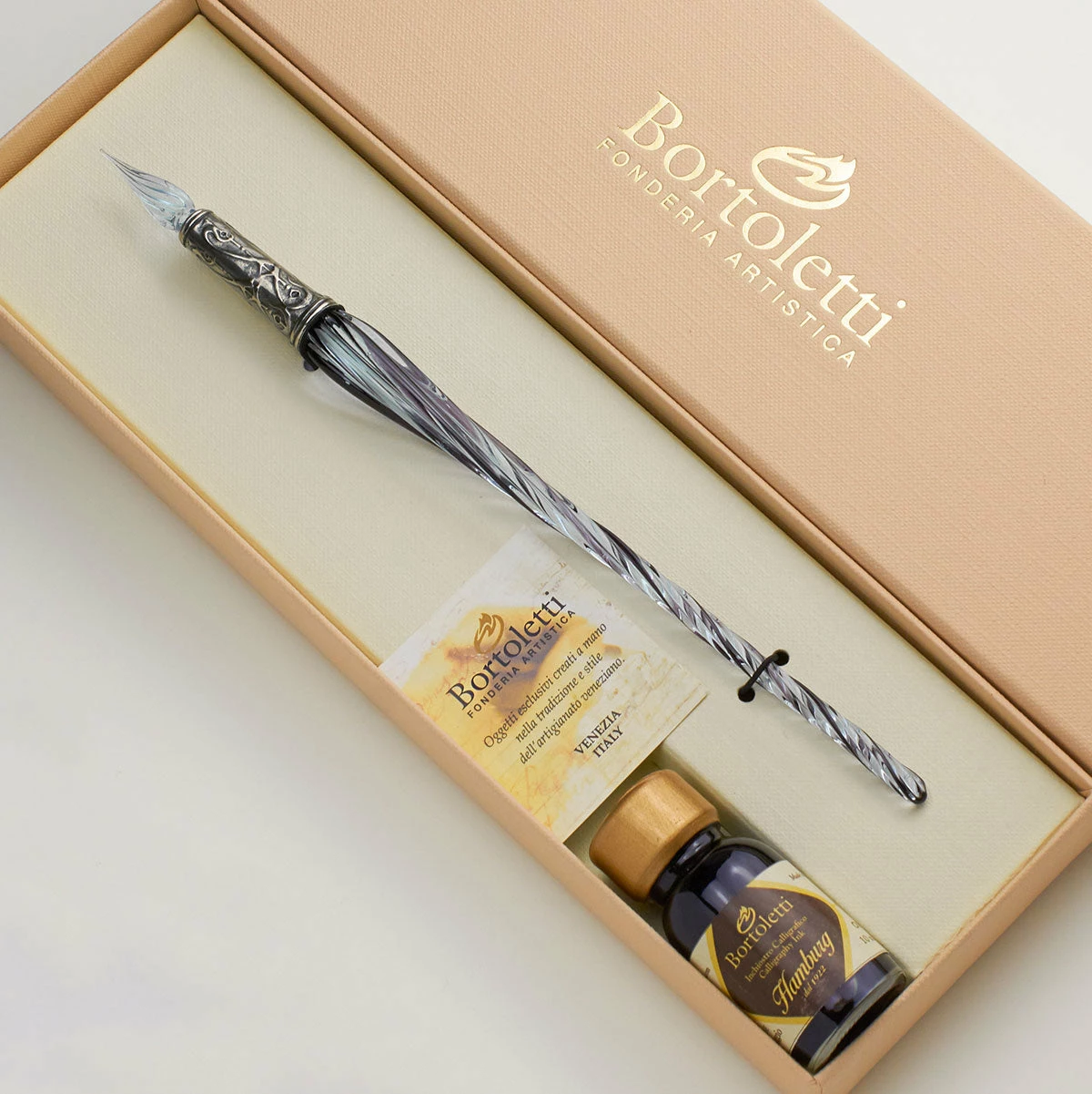 Β It is born from the extremely complex technical ability to master the famous βlamp workingβ of incandescent glass to be modeled with extreme wisdom. To crown the splendour of this object, the white bronze pen holder is the result of the lost-wax processing of the molten metal, a process that Bortoletti artisans carry out with great excellence.Β Β