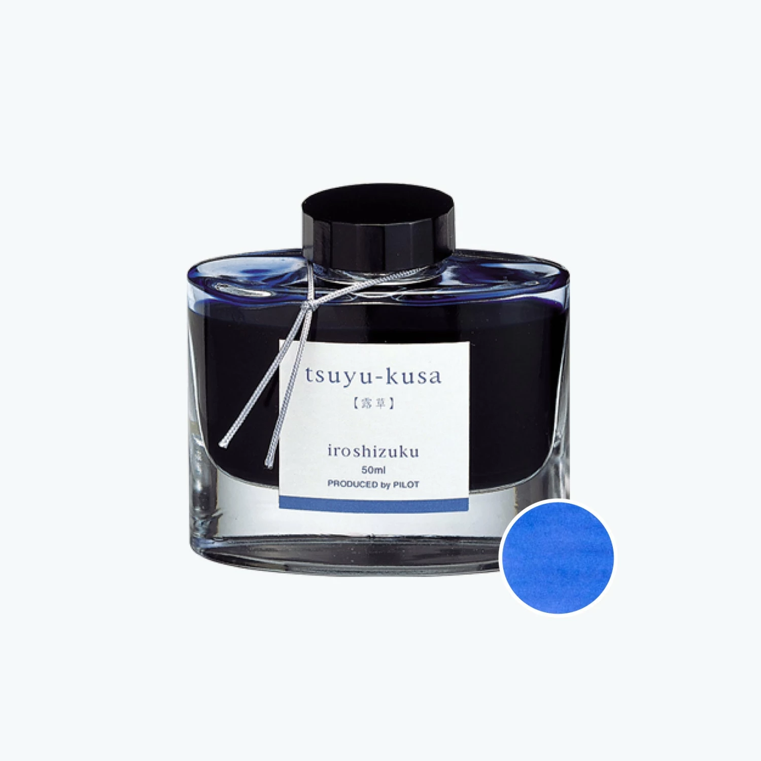 IroshizukuΒ is a dye based ink that comes in an elegant 50mL glass bottle with a wide opening for larger pens and an angled base, making it easier to reach the last few drops.Β