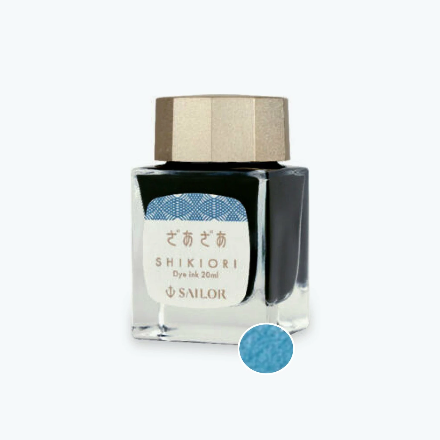 TheΒ SailorΒ ShikioriΒ Sound of RainΒ ink series follows on from the Sound of Rain fountain pen release. Zaza, which represents rain falling on the green leaves of plants and trees, is designed to compliment theΒ SummerΒ Rain fountain pen.