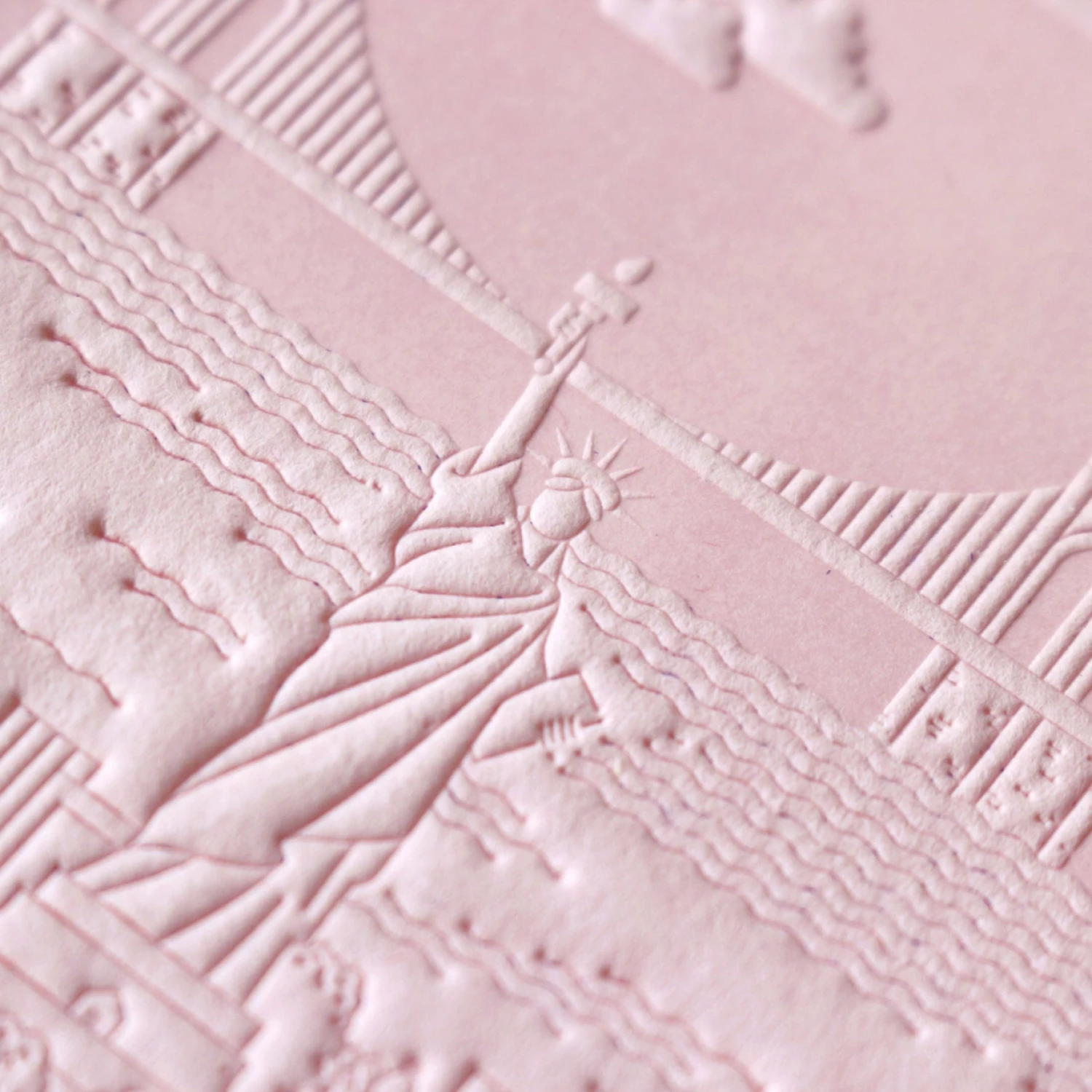 TheΒ tall islandΒ city ofΒ New YorkΒ isΒ inscribed into this high-quality notebook. TheΒ pink cover features iconic landmarks including the Statue of Liberty, Brooklyn Bridge and the Empire State Building β how many can you find?