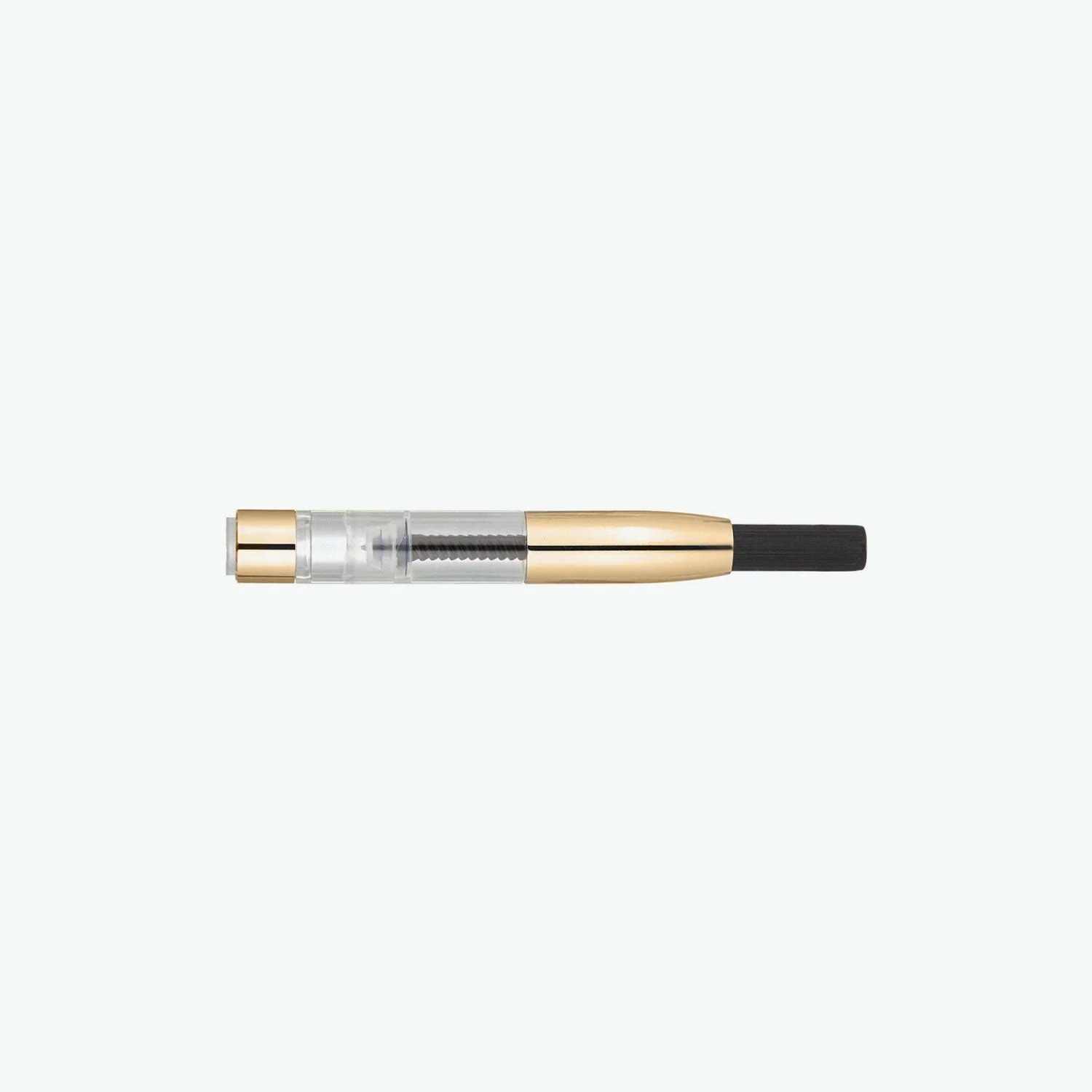 This gold-accented converter fits onto any Platinum cartridge/converter pen.Β Maximum capacity isΒ 0.61ml.