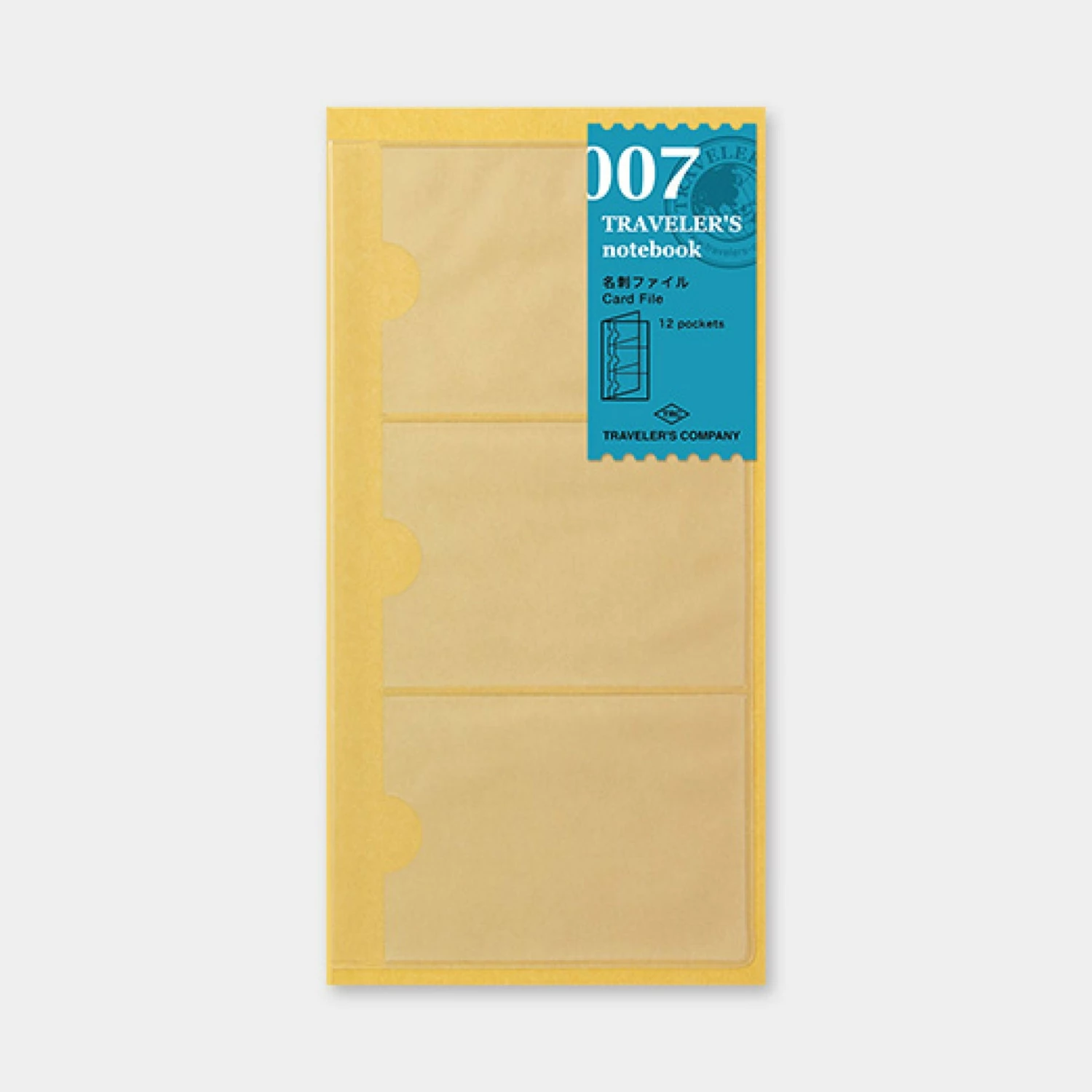 The 007 card file adds storage to the regular size Traveler’s Notebook by adding 12 card pockets. Each pocket is 91 x 66mm in size and can store business, travel or bank cards. The card file can be used by placing it around the inner paper notebook as if it is a cover for the notebook.