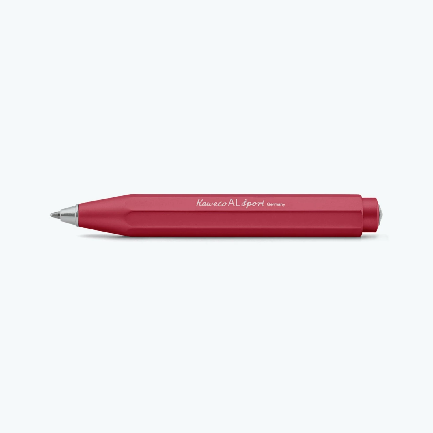 TheΒ deep red Kaweco AL Sport ballpoint pen balances a sporty look with superior quality.Β ItΒ closely follows the original octagonal design, which is very compact at just 10.3cm, making it easy to carry around and comfortable to write with. It is made from high-grade aluminium and features a silver metal Kaweco logo on the top of each push button, which uses a retractable mechanism.