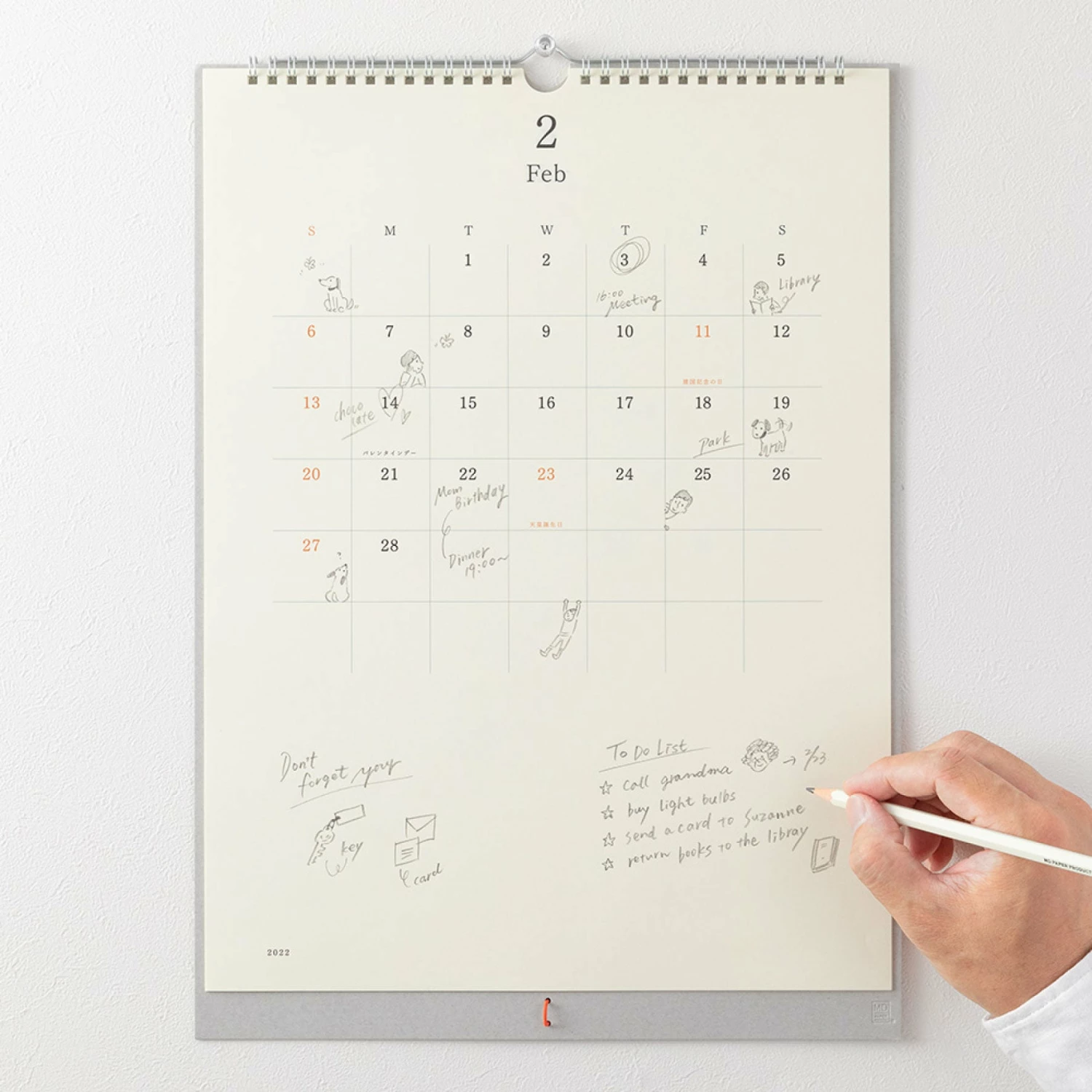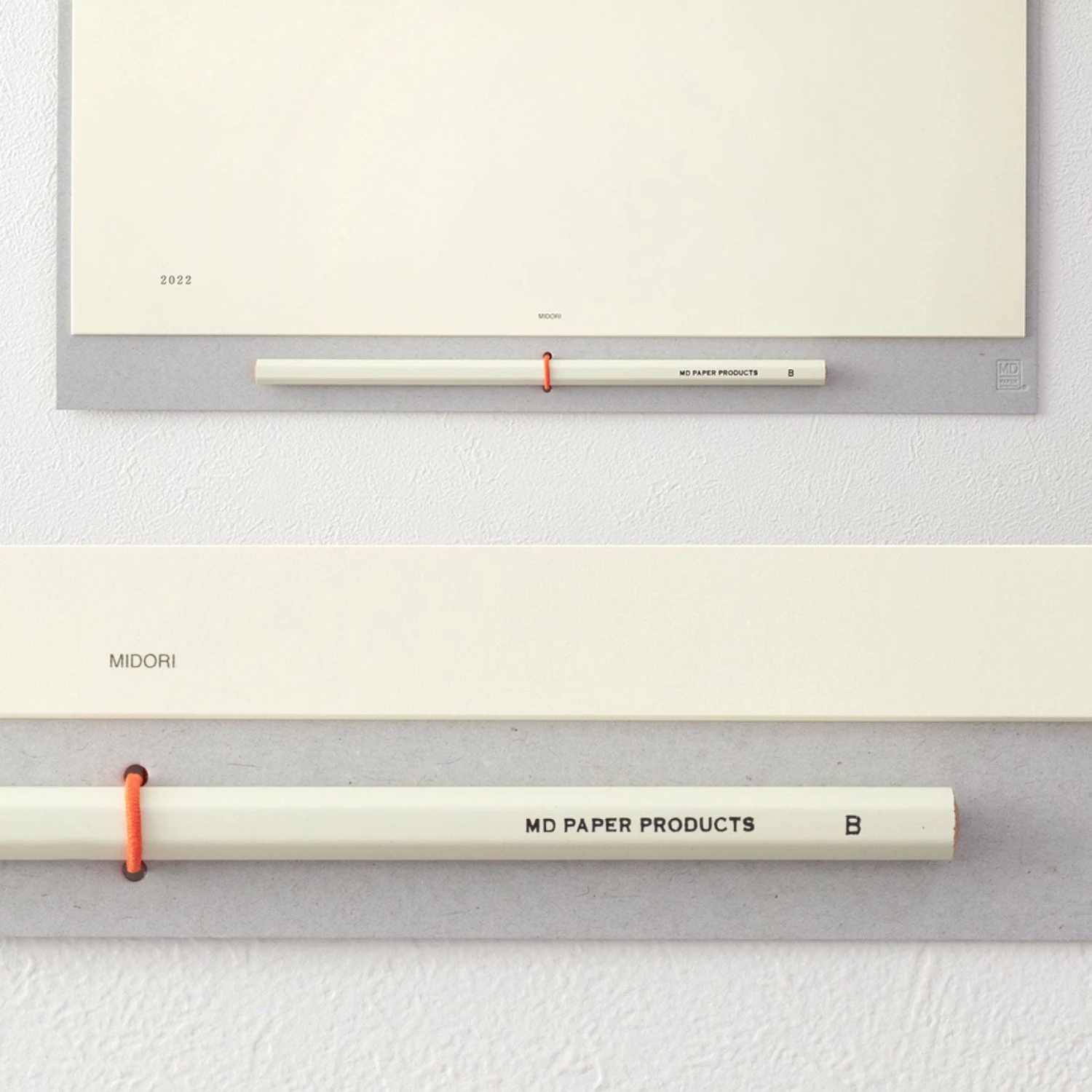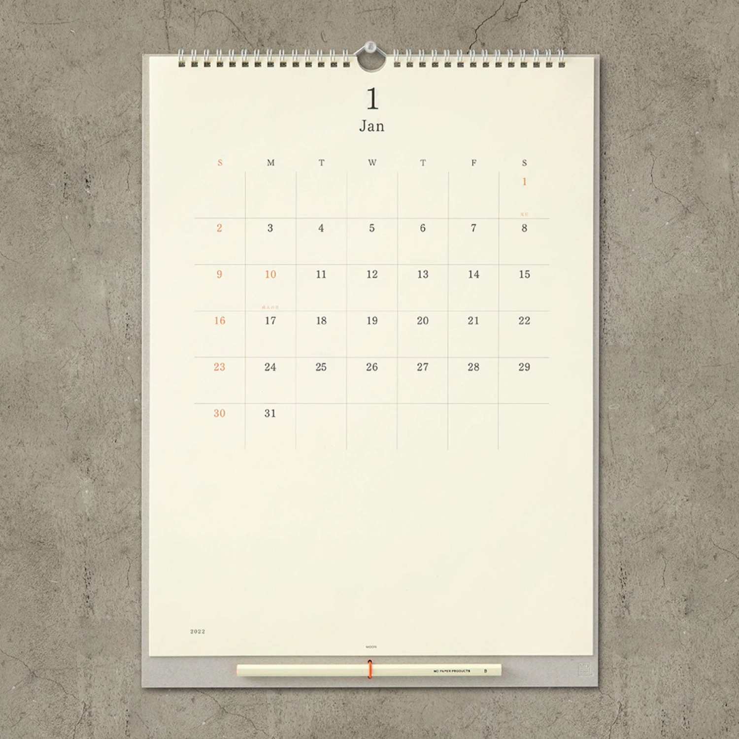 The wall calendar comes with an MD Pencil (B), making it easy to jot down ideas and plans. The pencil is held in place by a minimalist elastic pen holder in the same orange that adds a splash of colour to the other calendars.