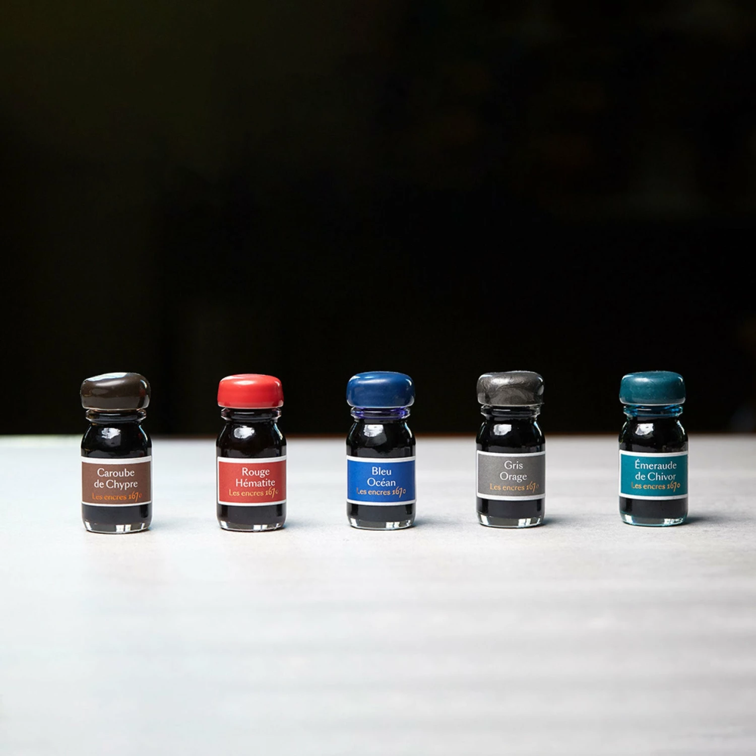 The J. Herbin 1670ย Anniversaryย boxed gift set includes five 10ml bottles of Rouge Hรฉmatite (Scarlet Red), Gris Orage (Stormy Grey), รmeraude de Chivor (Emerald of Chivor), Bleu Ocรฉan (Blue Ocean) and Caroube de Chypre (Carob of Cyprus). Each glass bottle features a hand-dipped wax seal cap.