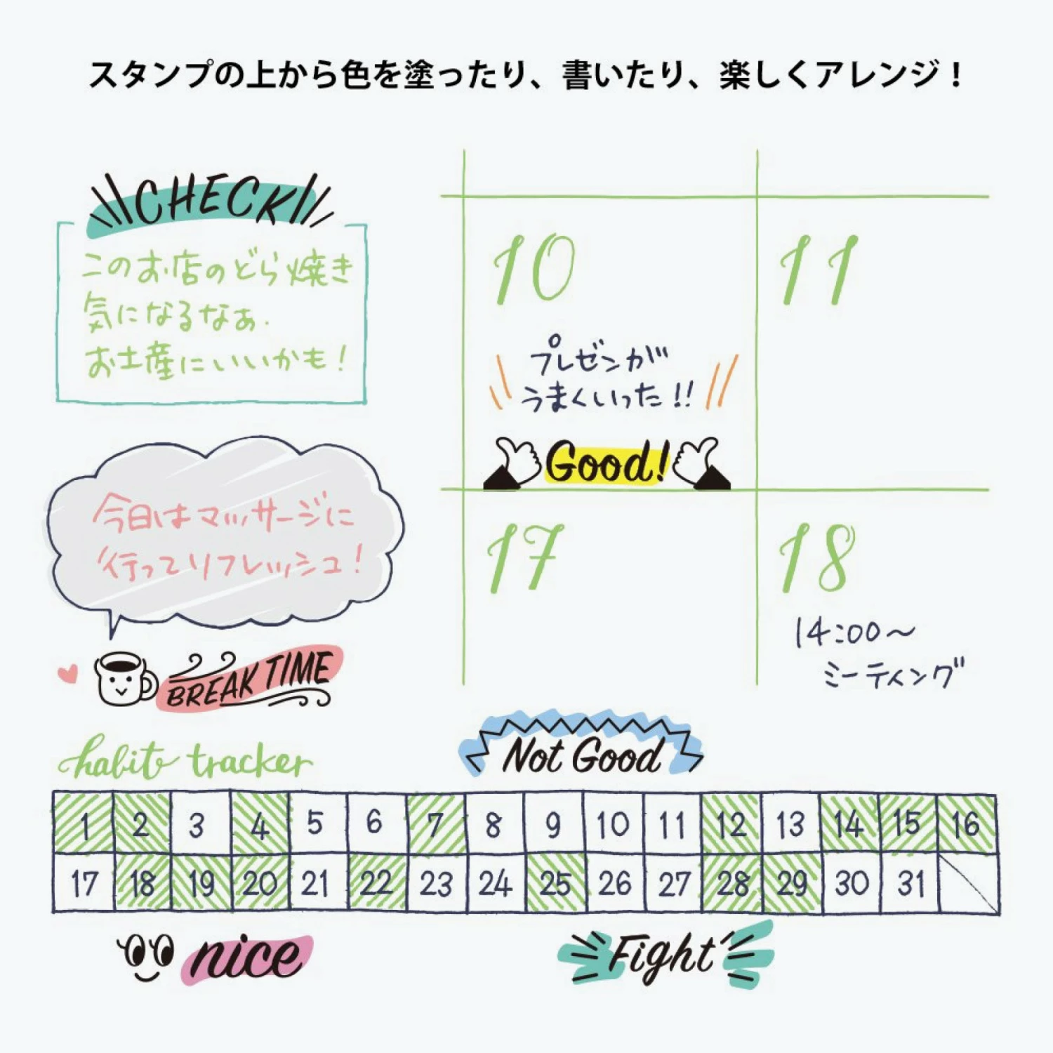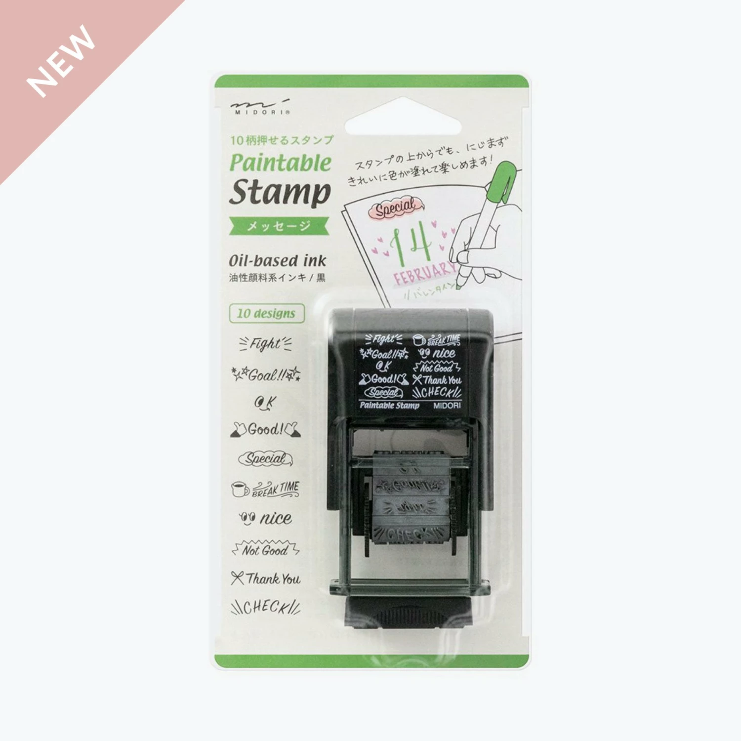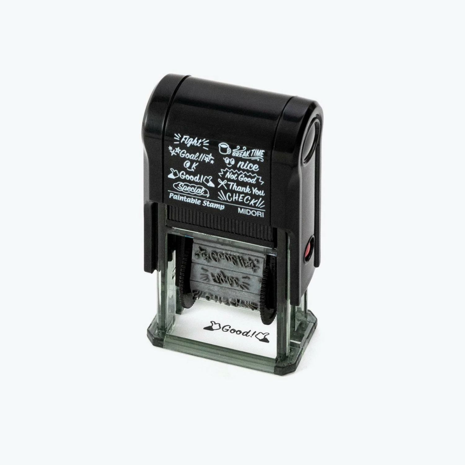 TheΒ MidoriΒ messageΒ rotating stamp features 10 designs includingΒ thank you, goal and break time. To use, simply rotate to the desired design and press down on the page. The stamp can be used 2,000 times and when the ink runs out, it can beΒ topped upΒ using theΒ Midori ink refill.Β
