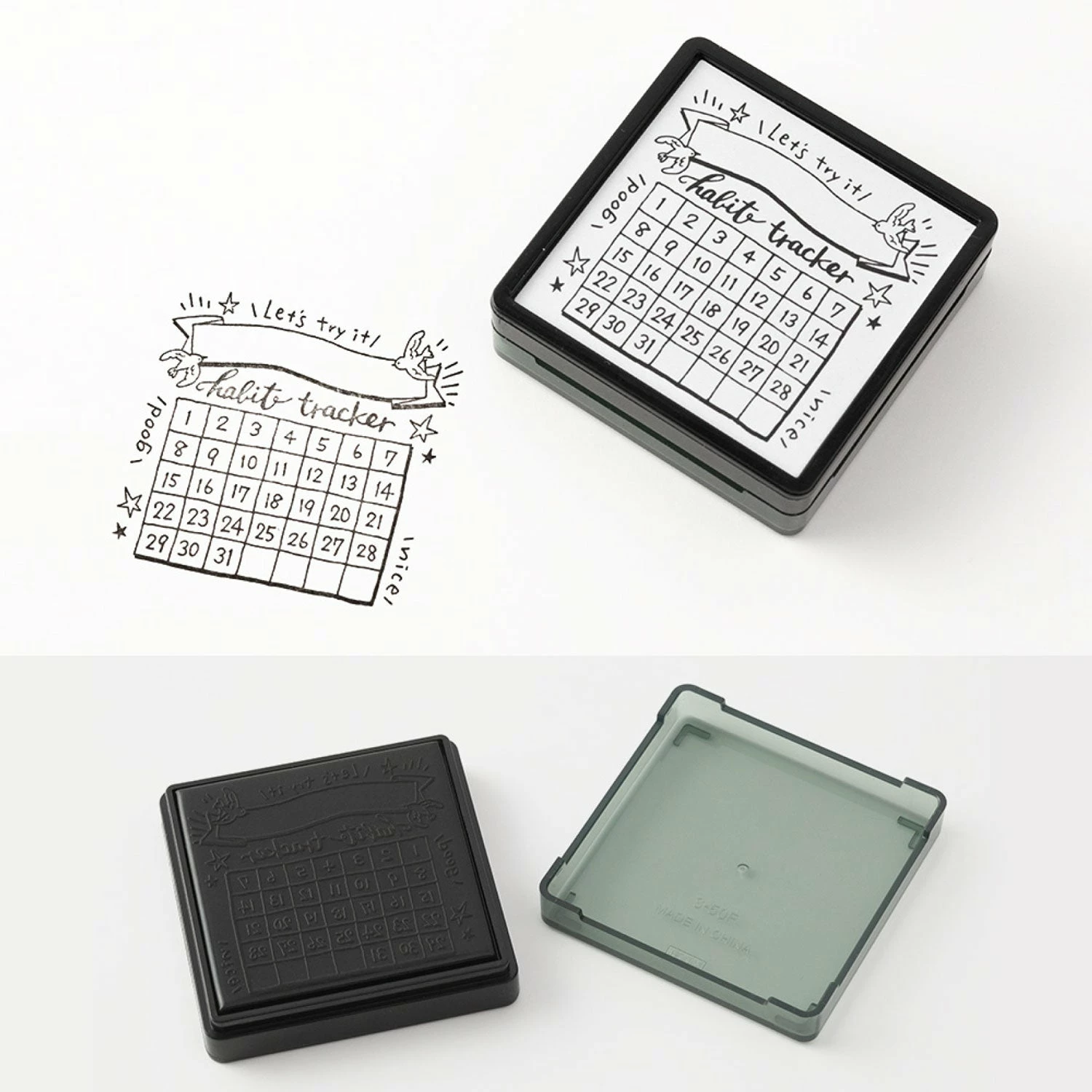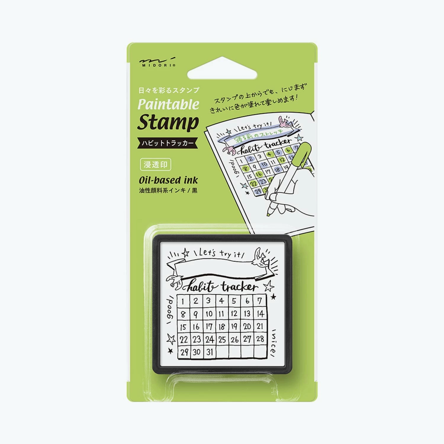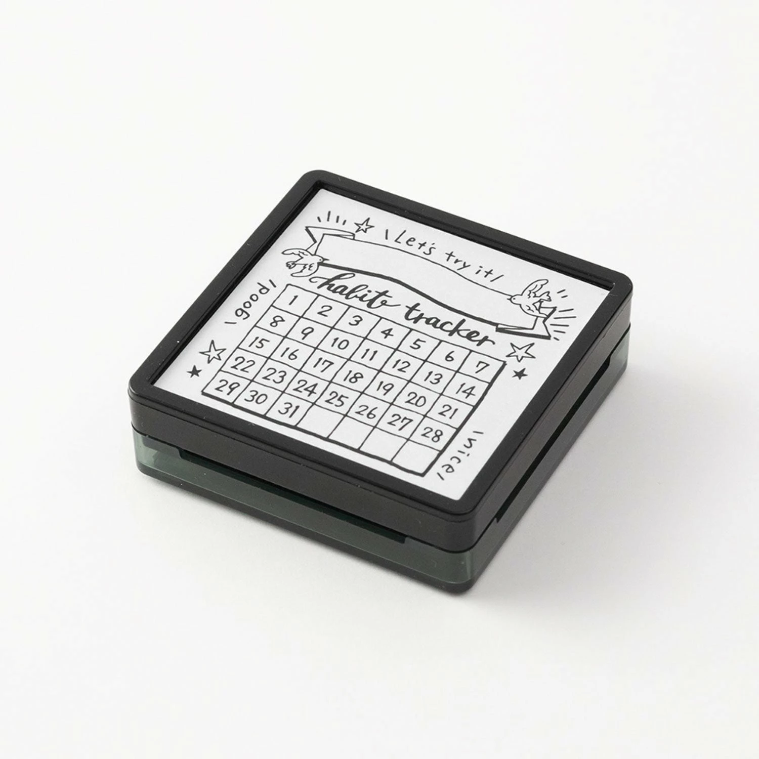 The habit trackerΒ MidoriΒ self-inking stamp is perfect for decorating, organising and keeping track.Β TheΒ design has space to fill in tasks, lists or notes and can be coloured in usingΒ theΒ Midori paintable brush pensΒ asΒ theΒ oil-based, black ink is waterproof.