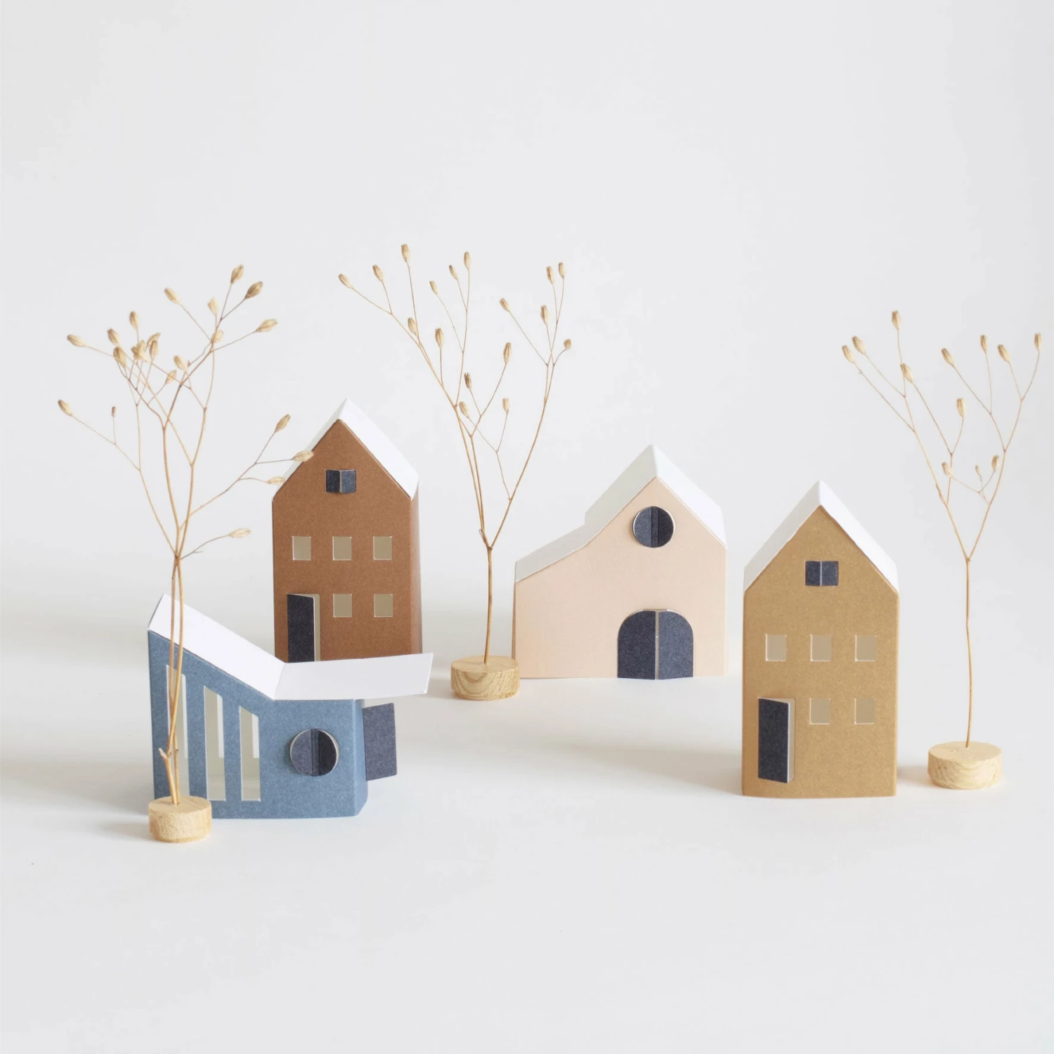 Build your own village with the Jurianne Matter tiny house ornaments.ย TรS is a collection of 12ย paper houses with a mix ofย traditional, rural, contemporary urban and modern designs in muted, earthy colours.ย The interior wallsย are adorned inย a trendy black & white wallpaper print.ย