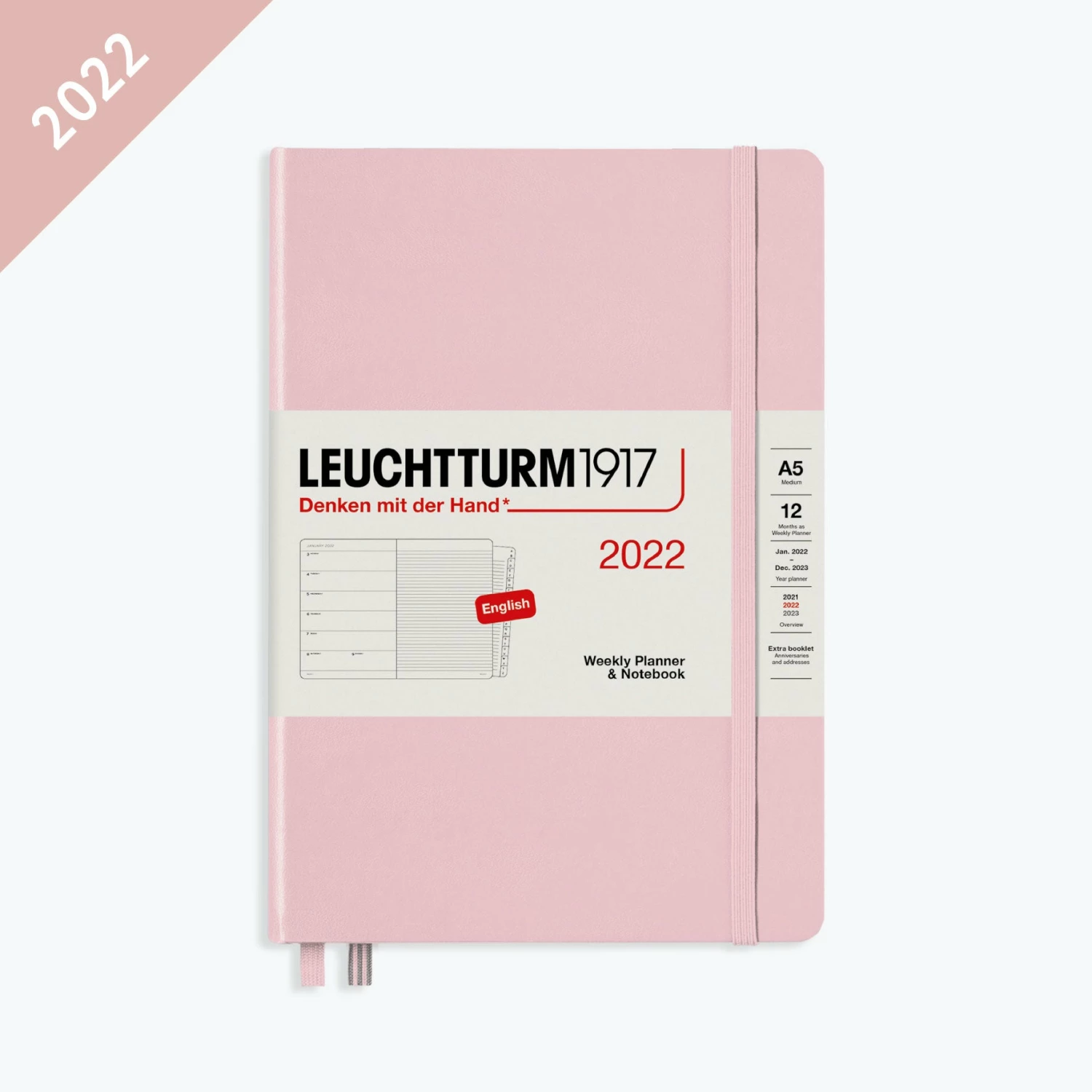 The A5Β powder pinkΒ Leuchtturm1917Β weeklyΒ notebookΒ diary is a simple yet functionalΒ companion for 2022.Β Every page features the calendar week on the left and a ruled notebook page on the right.Β