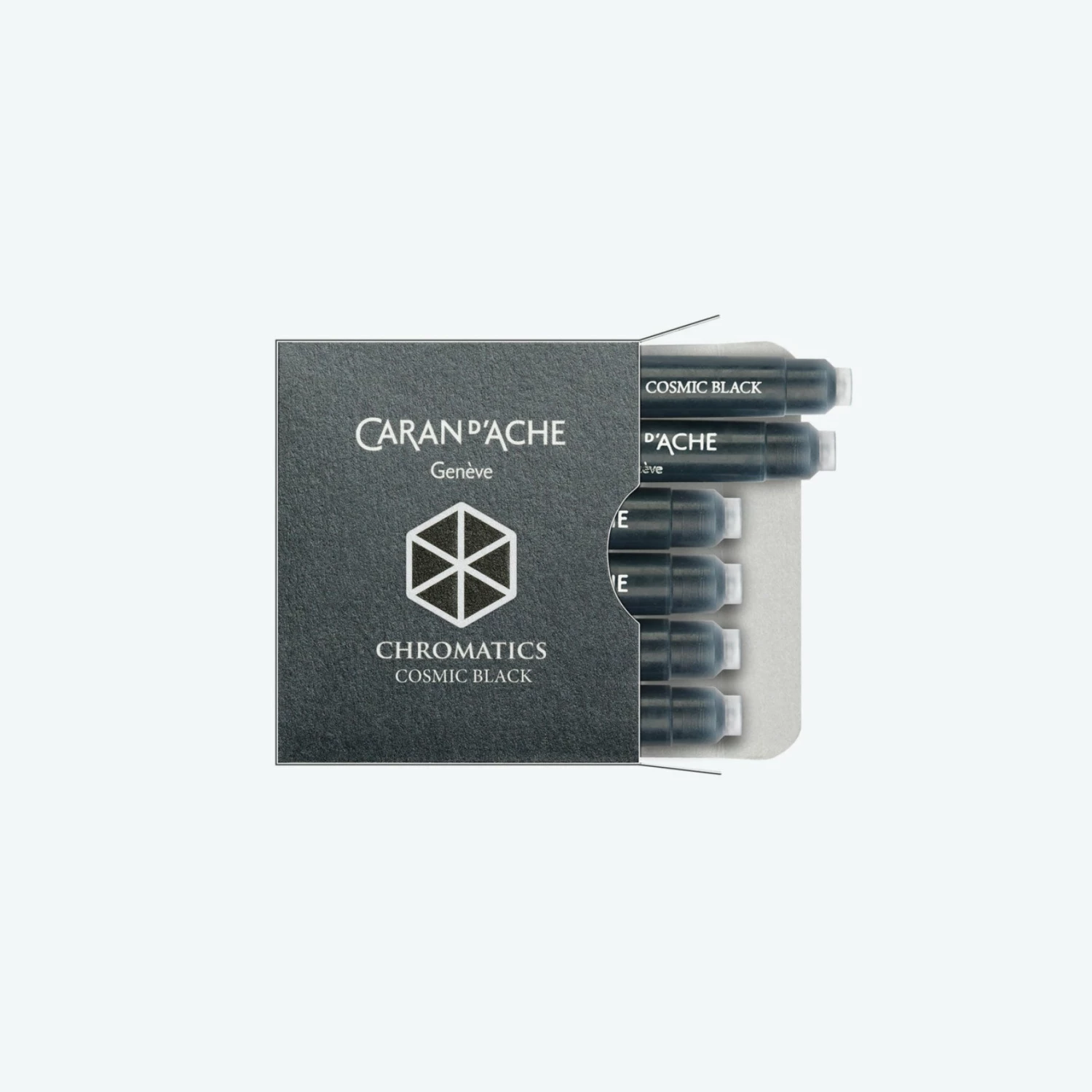 This pack contains 6 international ink cartridges filled with cosmic black ink. Can be used as a refill for the Caran d’Ache 849 fountain pens or any other brands that take international cartridges.