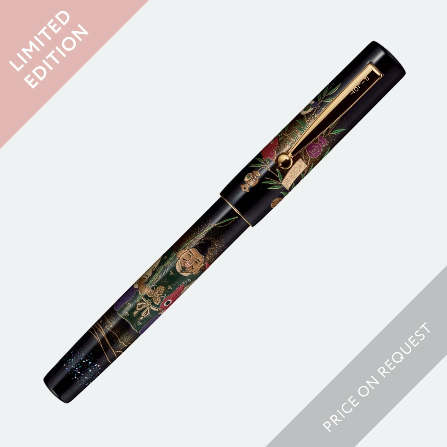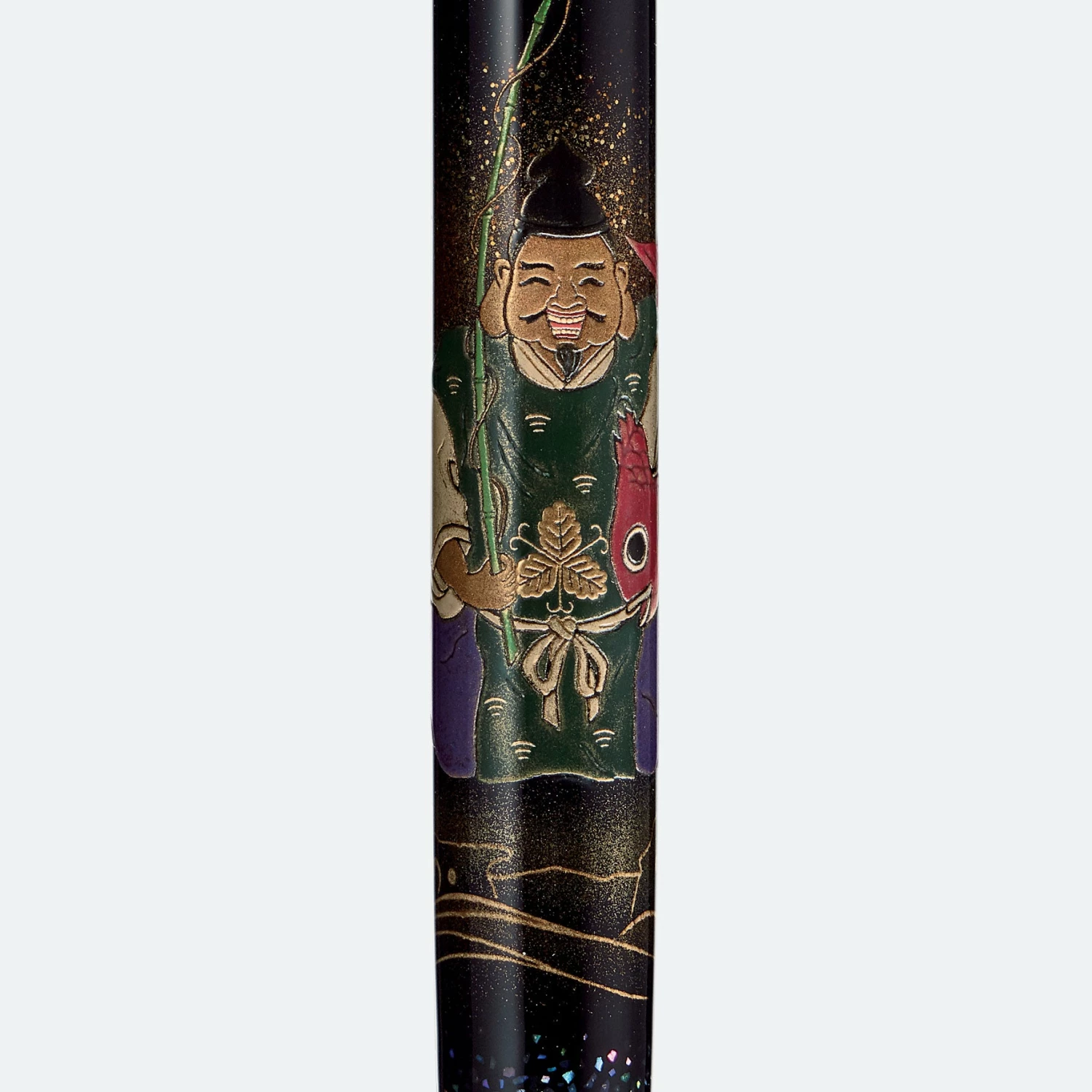 This fountain pen is adorned with the traditional image of Ebisu with a fukuzasa β a bamboo stalk believed to bring good fortune to businesses. In his left hand he holds a red snapper, and in his right a fishing rod.