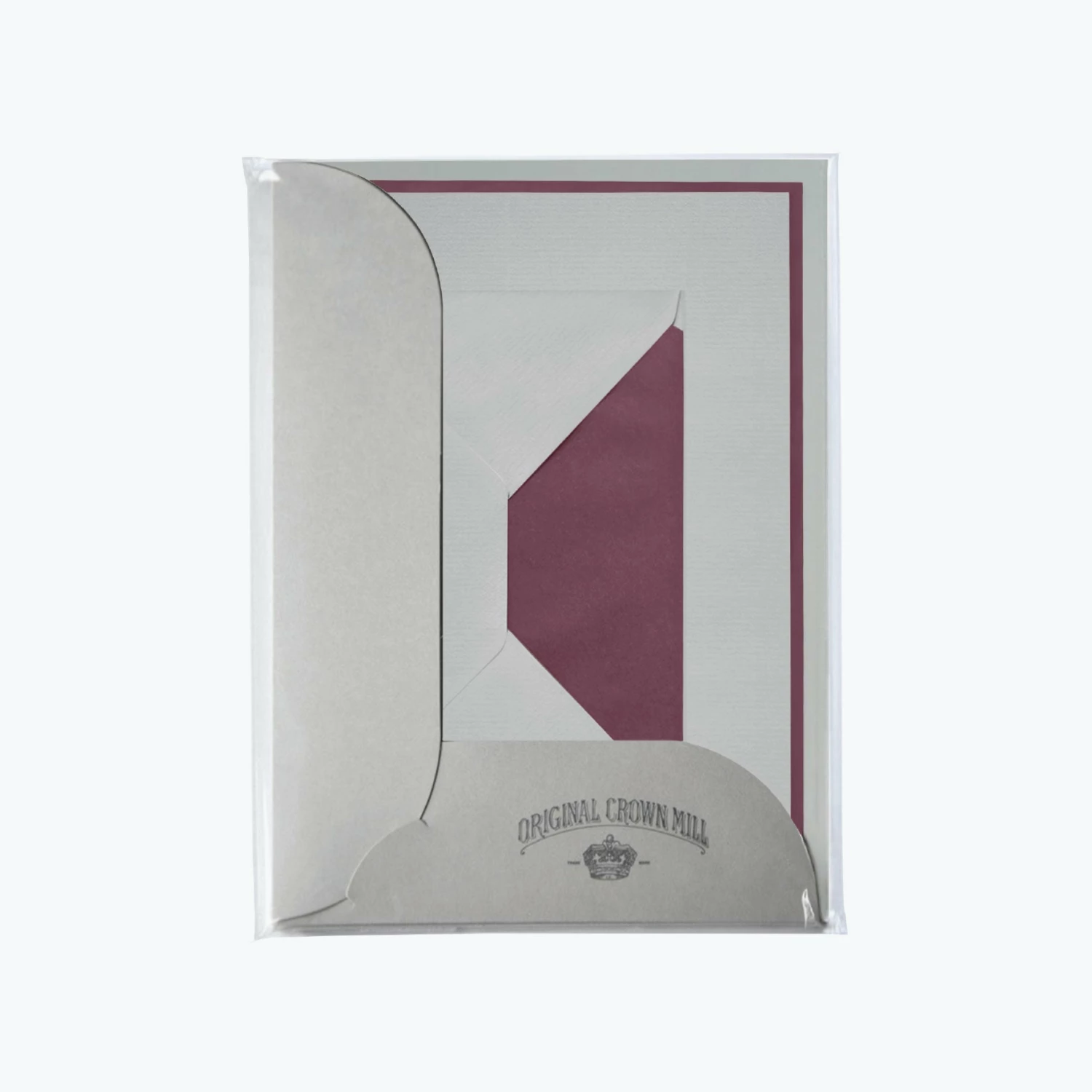 ThisΒ Crown MillΒ letter set includes 8 flat sheets of grey,Β laid paper with aΒ burgundy border and 8 matching C6 envelopes that are tissue lined. The set comes in a cardboard compendium, making it easy to store or take on your adventures.