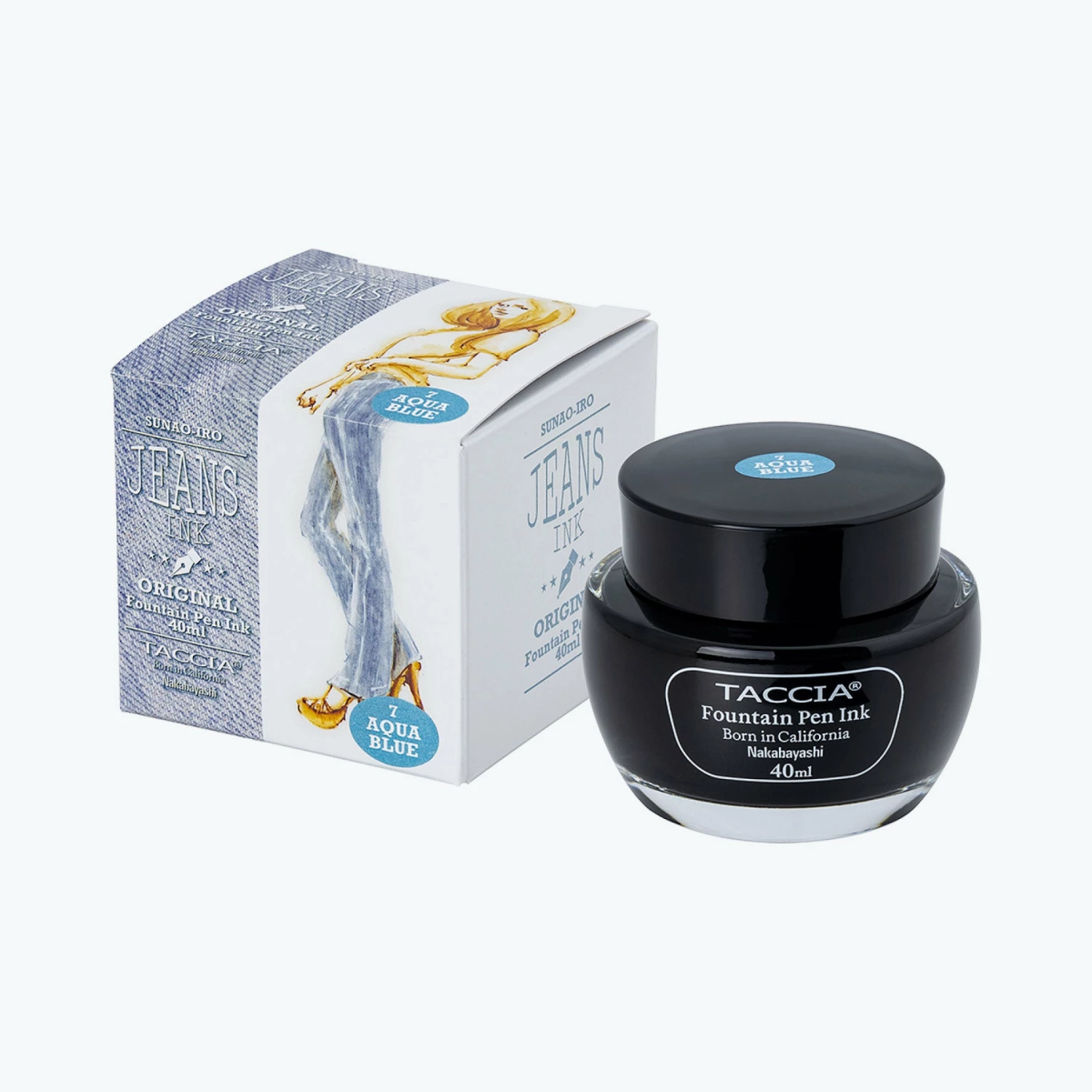 TacciaΒ Jeans aqua blue fountain pen ink is made in Japan and inspired by the Japanese way of seeing colours in a very pure, honest, and innocent way. The Jeans ink collection representsΒ the colour tones of jeans material ranging from black to aqua blue to depict the colourΒ changes of the material with continuous wear.