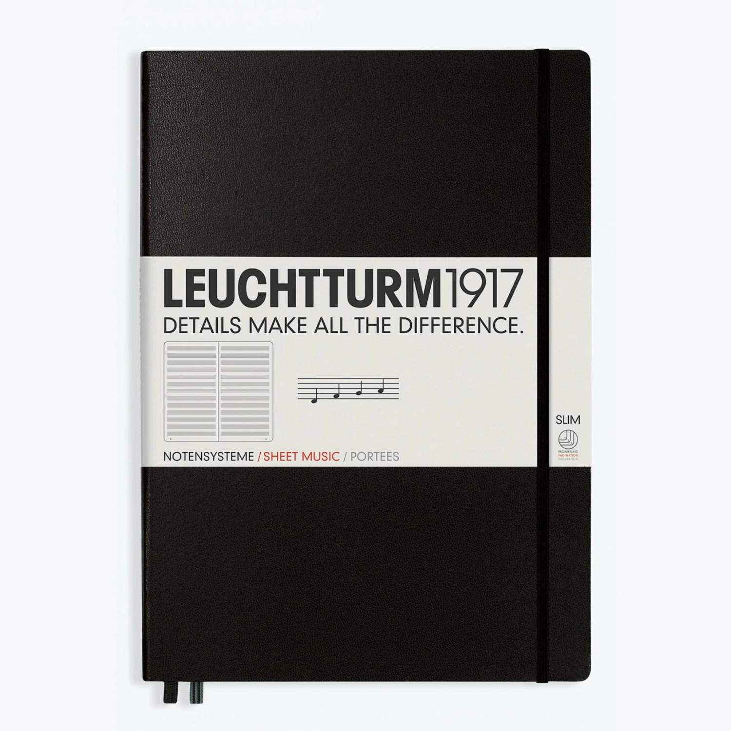 Created especially for musicians, the Leuchtturm1917 A4+ Slim Staves notebook contains full size manuscript paper. It features 121 numbered pages (14 staves on each page) and a table on contents. The A4+ Slim Staves notebook is printd on 100gsm papers and thread-bound so it remains flat when open. It comes with self-adhesive labels for archiving, as well as pocket on the back cover that is large enough to hold A4 sheets.Β