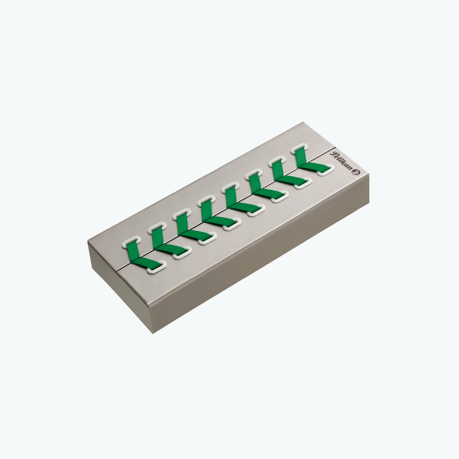 The barrel with the white and green stripes is made of cellulose acetate that has been very carefully crafted and turned to create this beautiful sleeve. The stylized Pelikan beak clip is plated with 24kt gold.