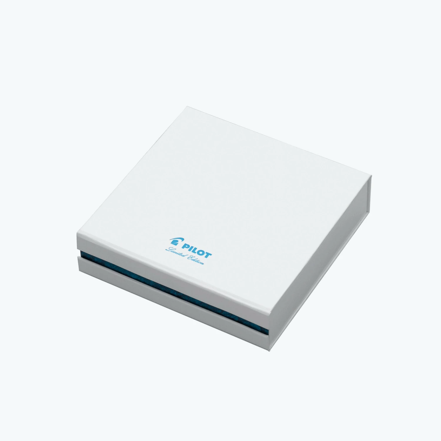 The 2019 Limited Edition CaplessΒ (Vanishing Point) fountain pen with aquamarine detail. Trim and nib are rhodium plated. Presented in square white premium box with little drawer to hold cartridges.Β Converter-40 included inside the pen.