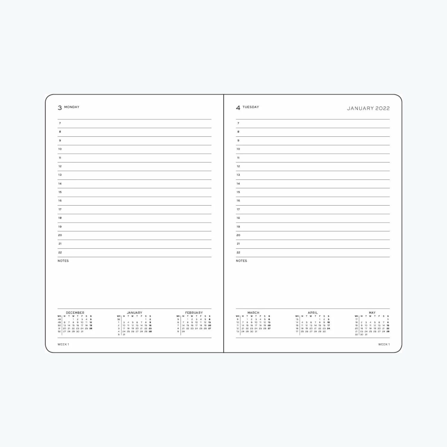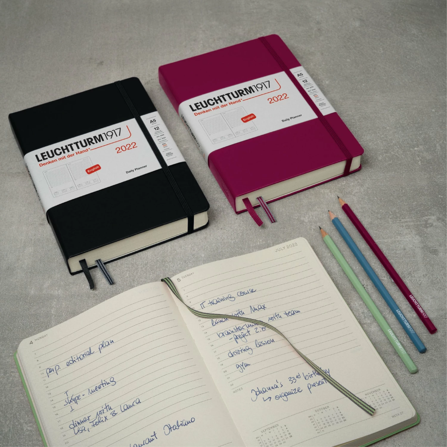 The A6 blackย Leuchtturm1917ย daily plannerย diary is a simple yet functional companion for 2022. It features a full page per day including Saturday and Sunday, with a line for each hour from 7am to 10pm.ย