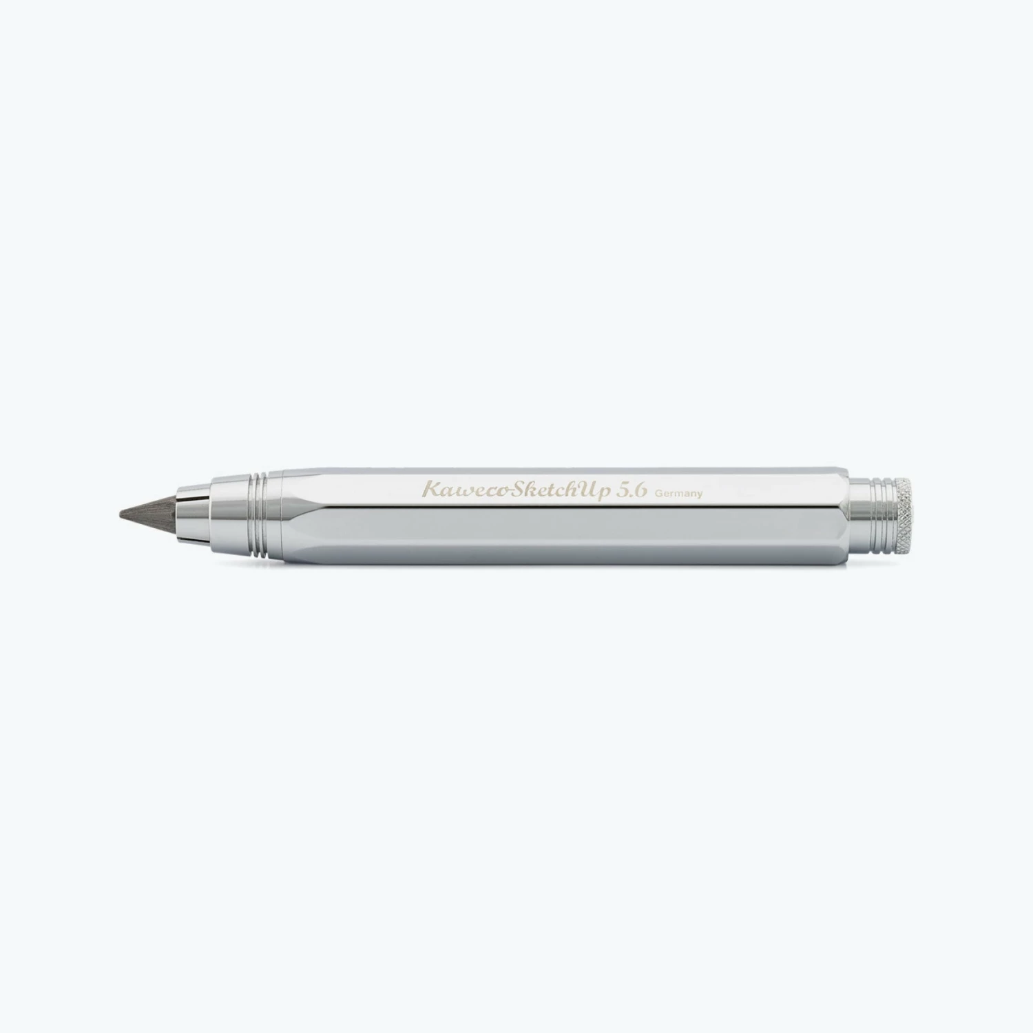 Featuring a shiny chrome finish, this Kaweco Sketch Up closely follows the original octagonal design. Although it is compact in length, measuring at just 10.3cm, the solid brass barrel with polished chrome noseΒ means it is a sturdyΒ pencil weighing 36g. A sharpener is integrated in the removable push button at the top.