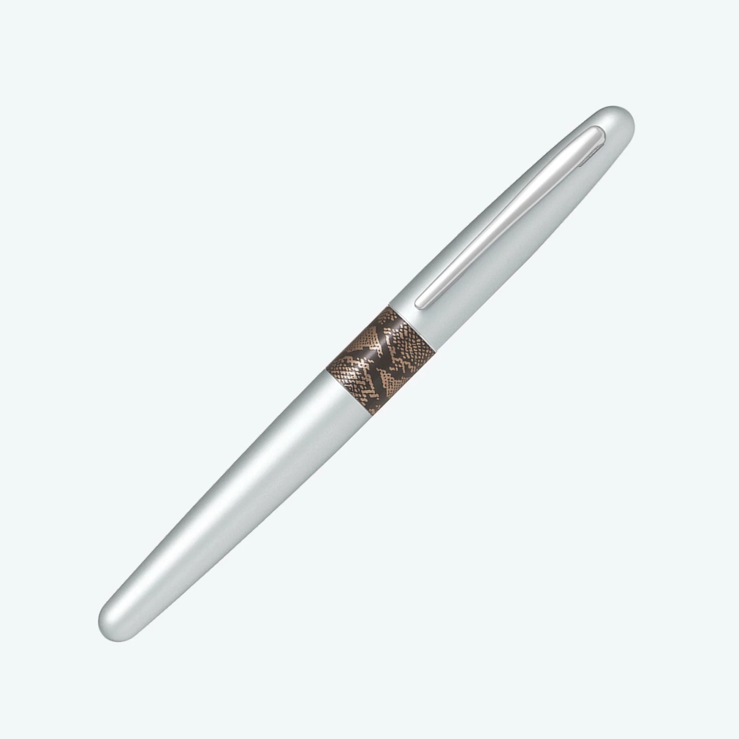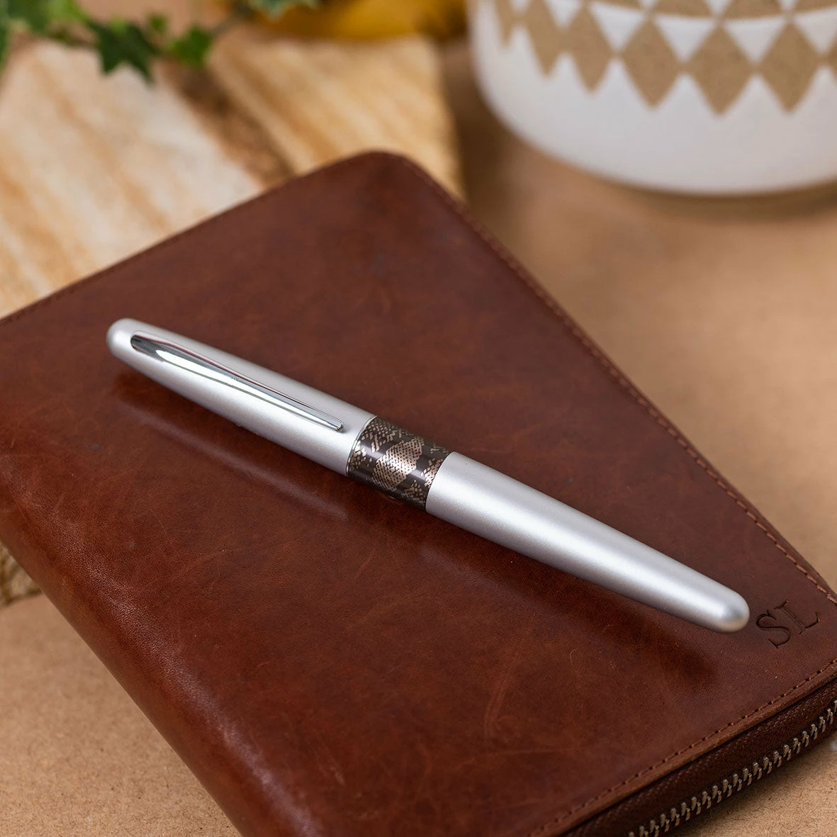 The Pilot Metropolitan isย an all round fountain pen – it is stylish, well made and great value for money, making it the perfect everyday or beginner pen.ย Thisย silver metal bodied pen has aย pythonย pattern accent band, silver trim and a quality steel nibย that is known for its smoothness.ย