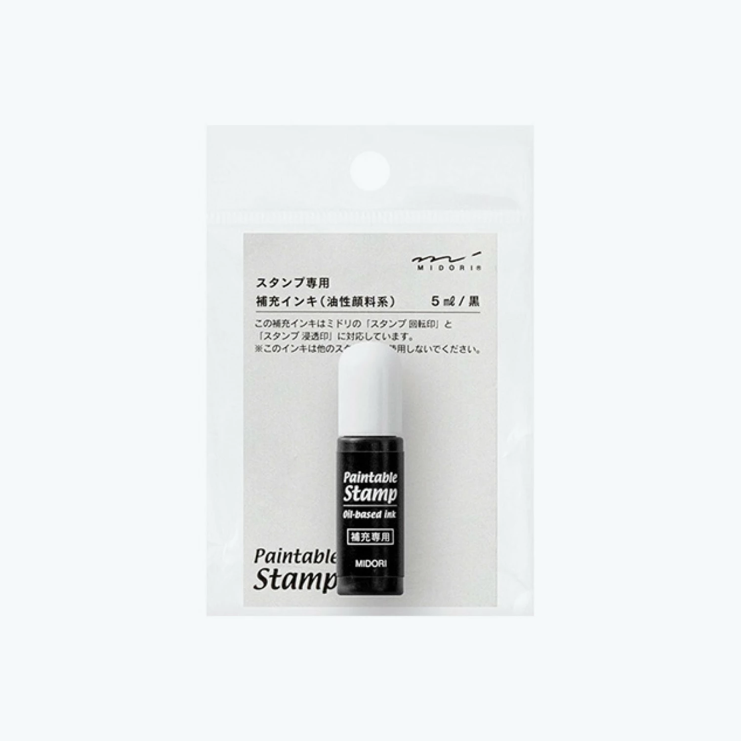 The Midori stamp refill is a waterproof, oil-based ink in a 5ml bottle.Β It is compatible with Midori stamps orΒ other oil-based black ink pads.