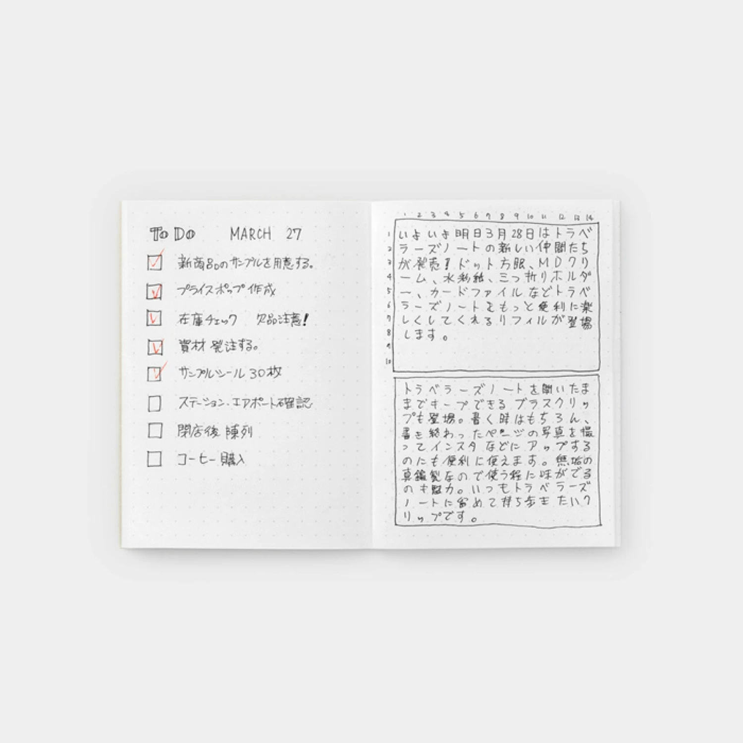 The 014 dot grid is a refill for theย passportย size Traveler’s Notebook and comes with 64 dot grid pages. The refill uses MD paper, which is both smooth and resistant to feathering and show through, making it ideal for all writing instruments including fountain pens. The dot grid features 5mm x 5mm dots in a subtle grey colour, making it ideal for bullet journaling, writing and drawing graphs/boxes.