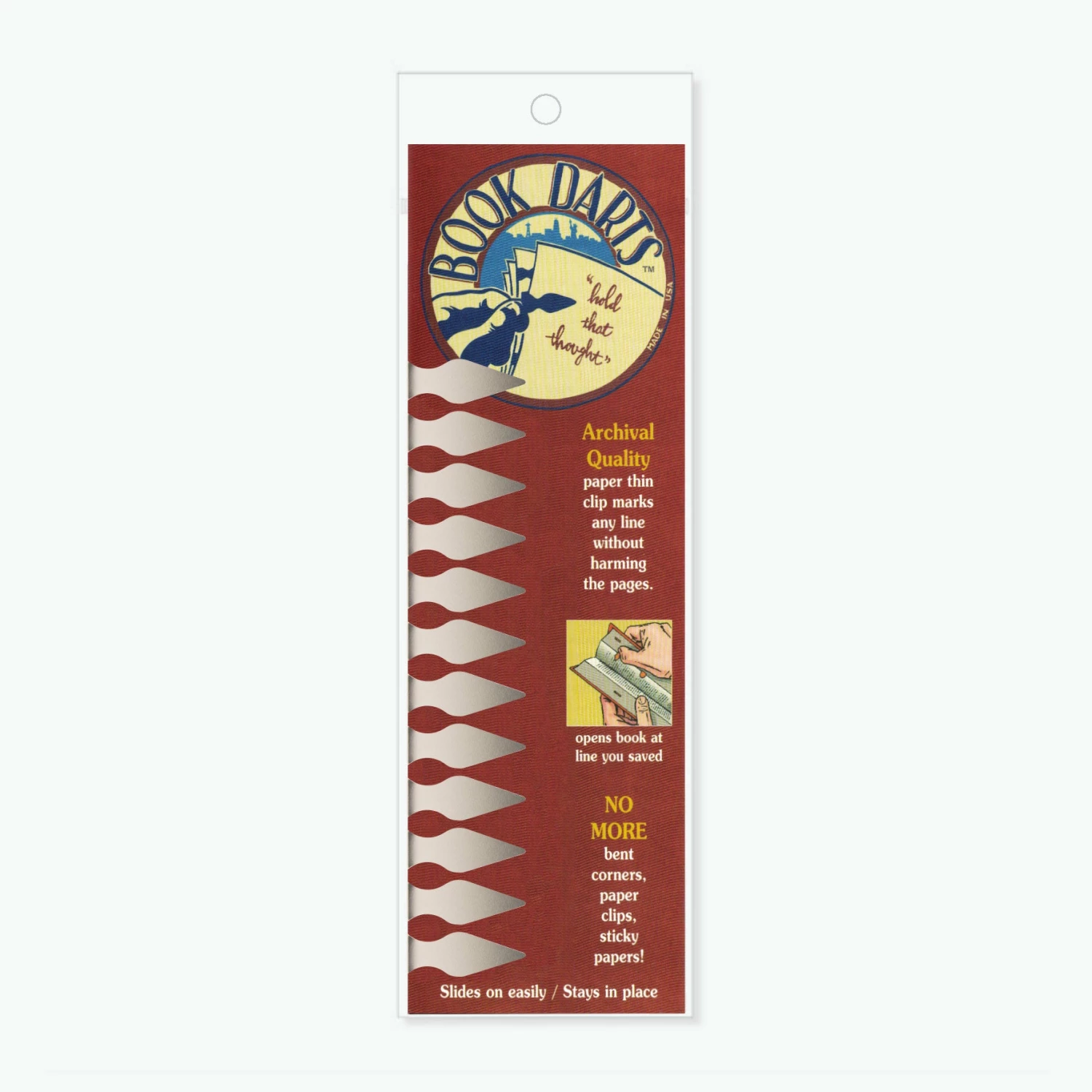 Book Dartsย are precision-cut, paper-thin metal line markers that slide easily on and off any page without damaging it. Thisย sleeveย contains 12ย stainless steel, silver book darts that can be reused over and over.