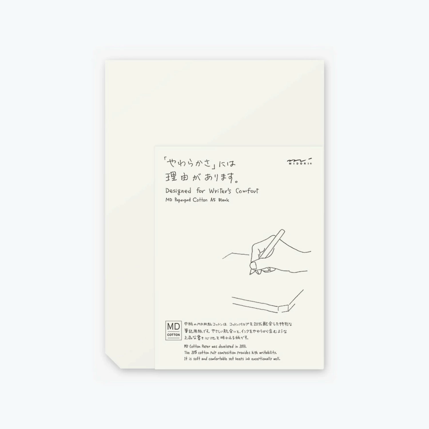 The Midori A5 Notepad contains 90 sheets ofΒ cotton,Β blankΒ MD Paper and is backed with sturdy card for durability. MD Paper Cotton was developed in 2013, with cotton pulp used for 20% of the materials, giving it a soft, fuzzy texture. Cotton paper is extremely durable and preservable, and has long enjoyed a reputation as high-quality paper. It is resistant to feathering and show through, making it ideal for all writing instruments including fountain pens.Β