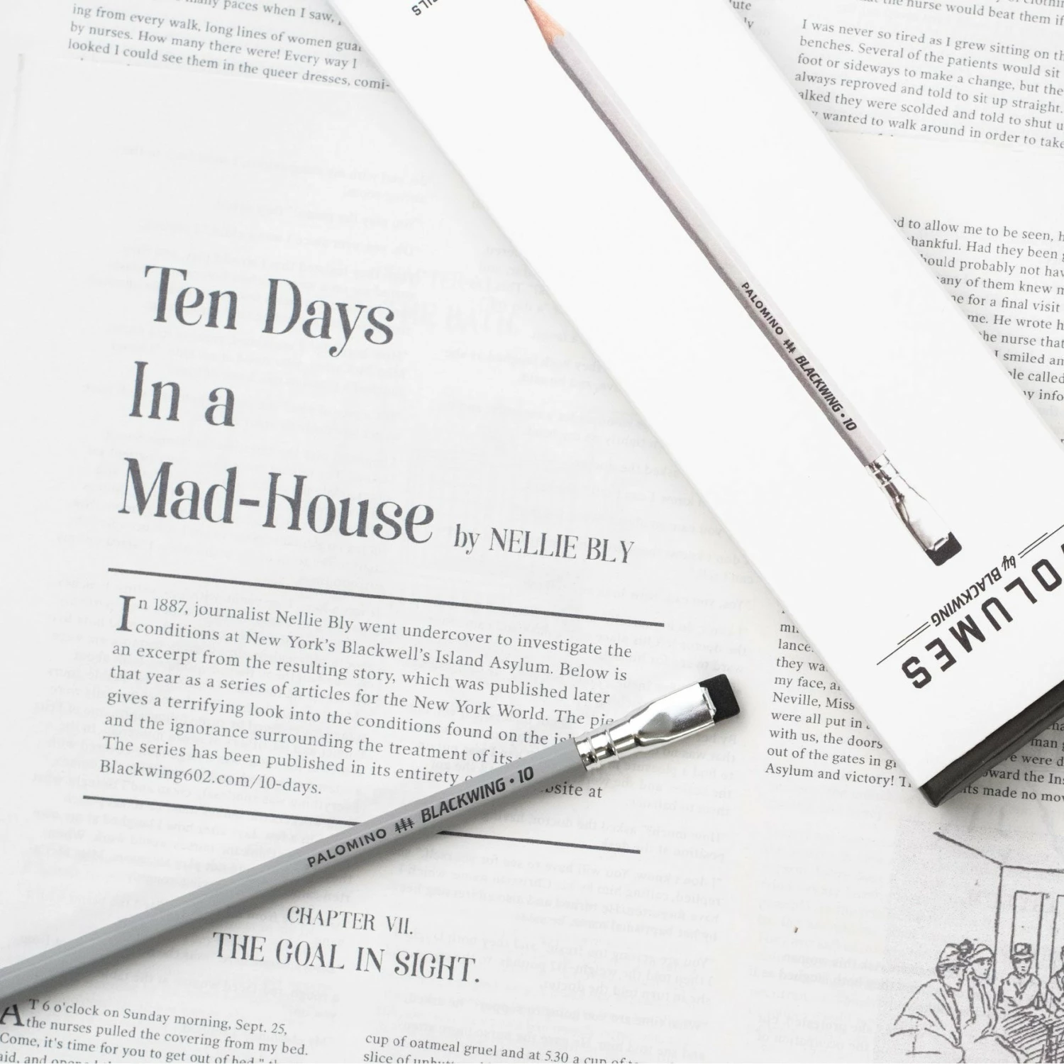 The Blackwing 10 is a tribute to Nellie Bly – and investigative journalists like her – who keep citizens informed, and give them a voice. It features a matte grey newsprint finish, dark grey imprint, silver ferrule, dark grey eraser, and extra-firm graphite. The number 10 represents the ten days Miss Bly spent investigating a story that has impacted countless lives.