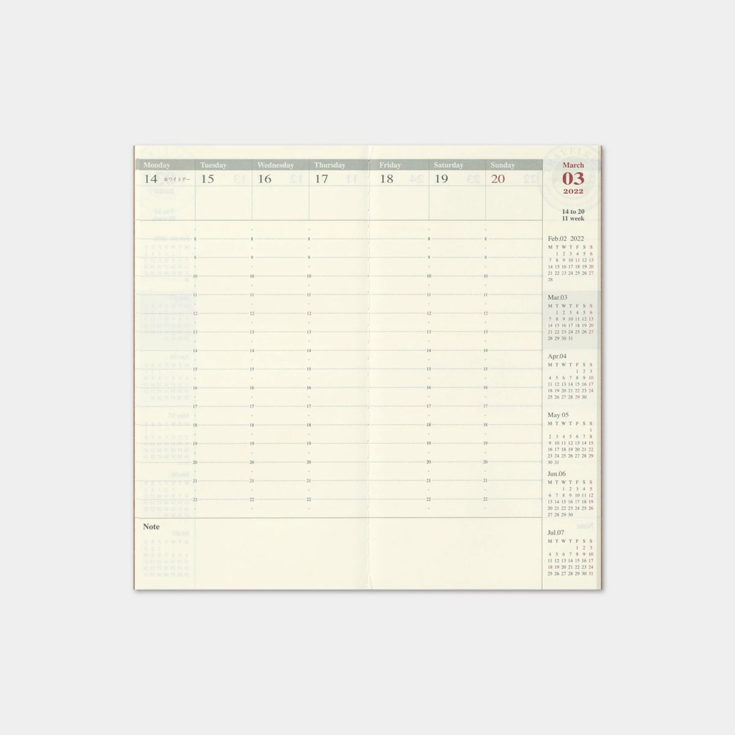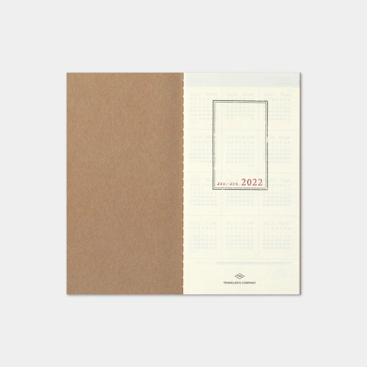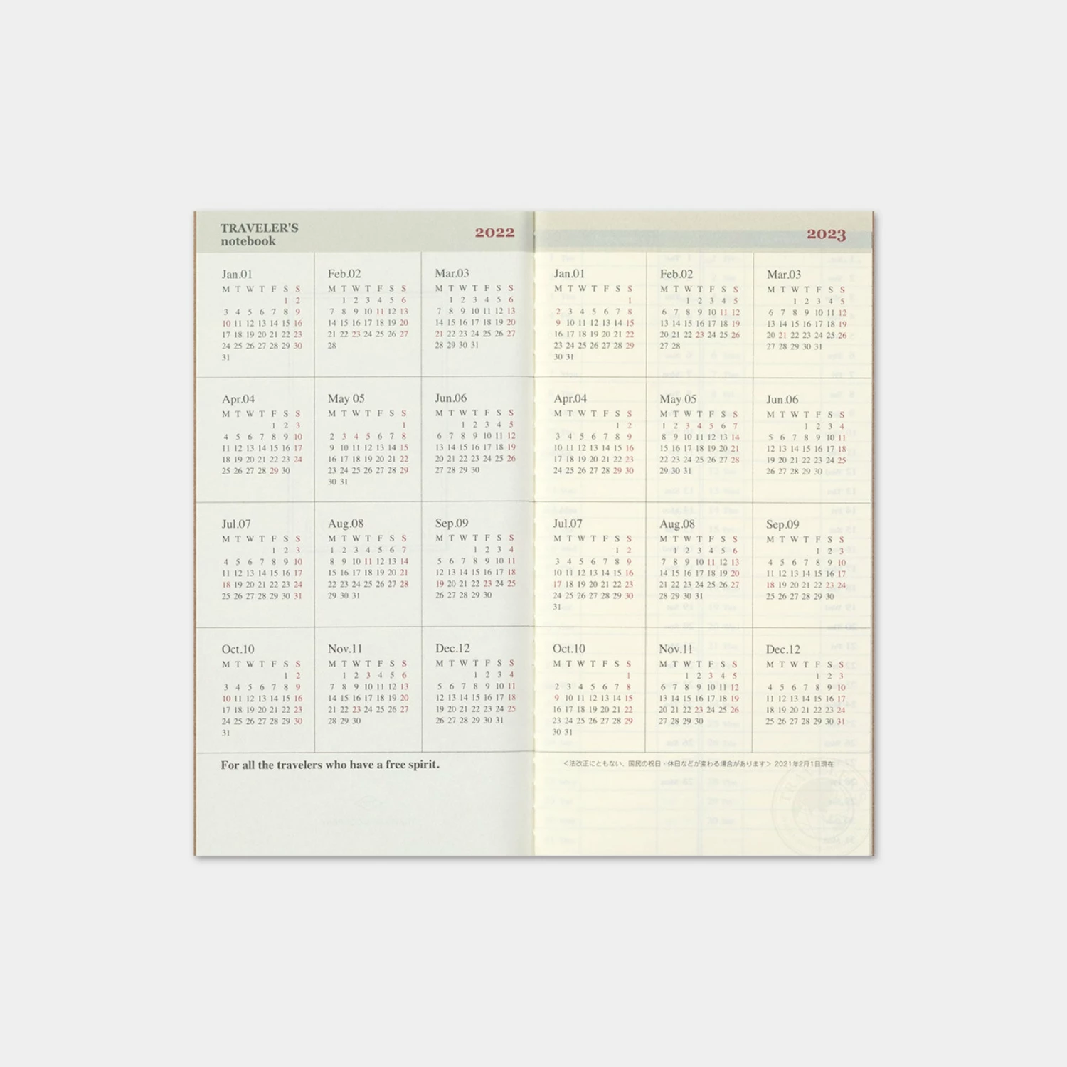 The Traveler’s Company 2022 diary (weekly vertical) is a regular size insert for the Traveler’s Notebook that features two refills, with each covering a 6 month period (Jan-Jun 2022 and Jul-Dec 2022).