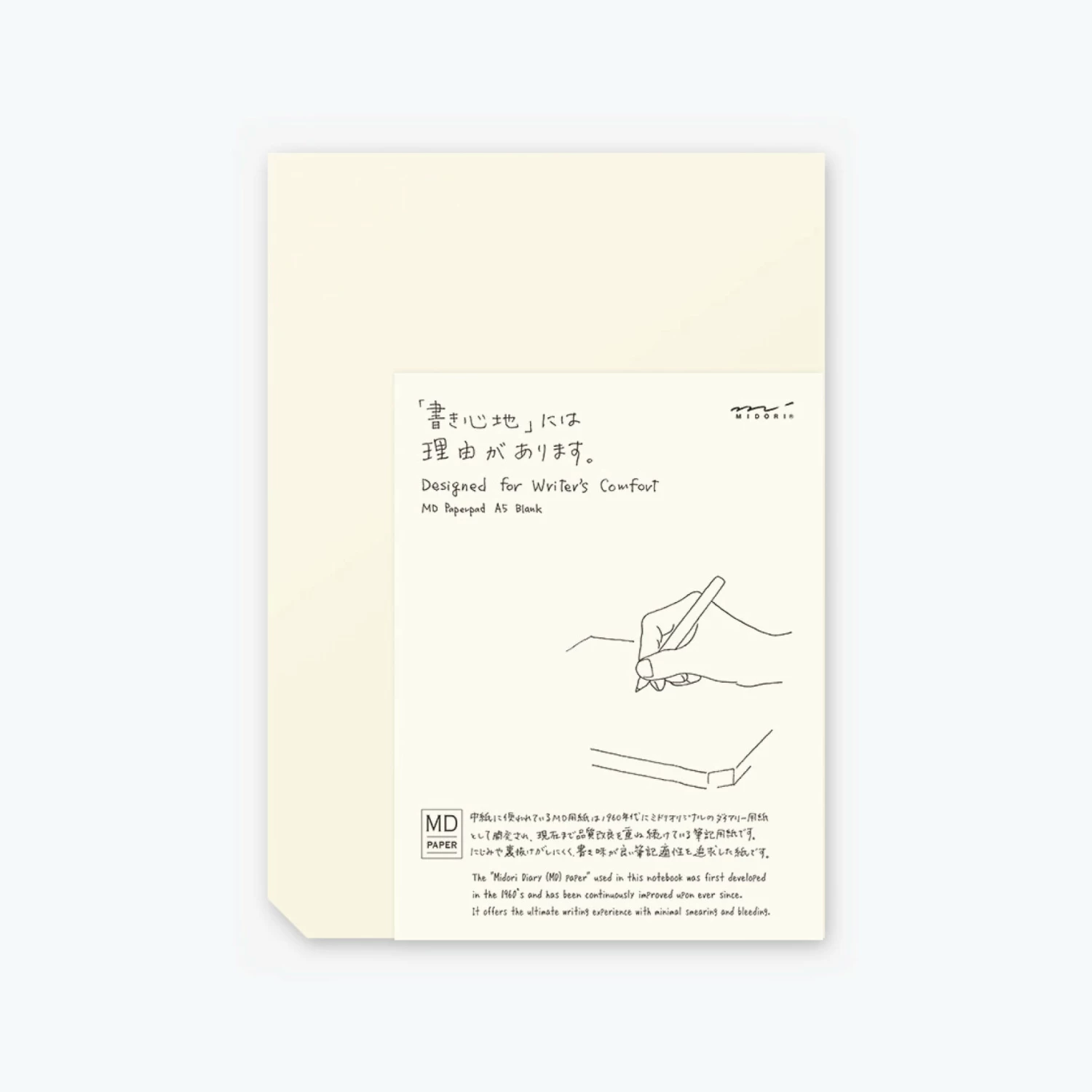 The Midori A5 Notepad contains 90 sheets of cream,Β blank MD Paper and is backed with sturdy card for durability. The MD Paper is smooth and resistant to feathering and show through, making it ideal for all writing instruments including fountain pens.Β