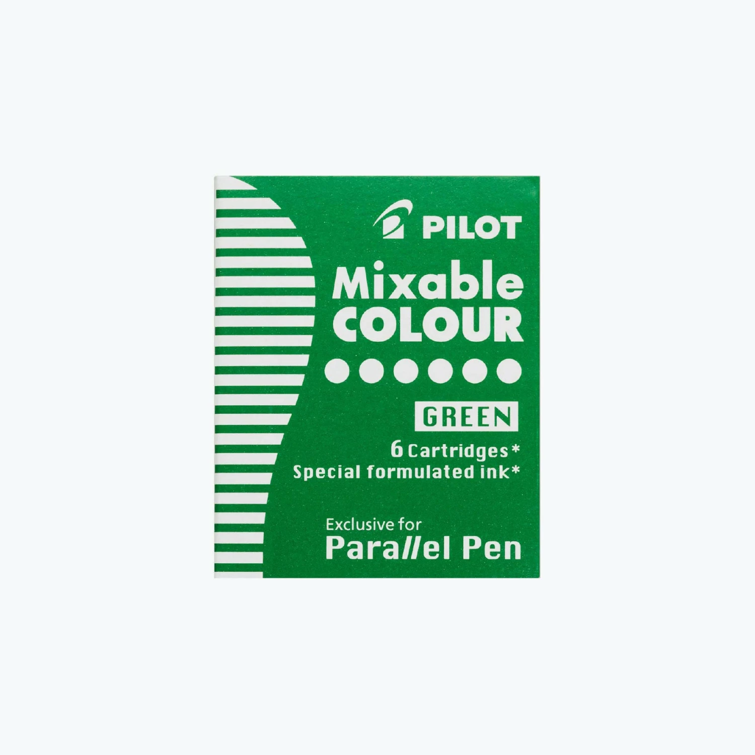 The greenΒ PilotΒ mixable colour ink cartridges are for use with Pilot Parallel Pens exclusively. They are filled with a special formulated dye based ink that can be mixed with other colours to create a gradient effect.Β