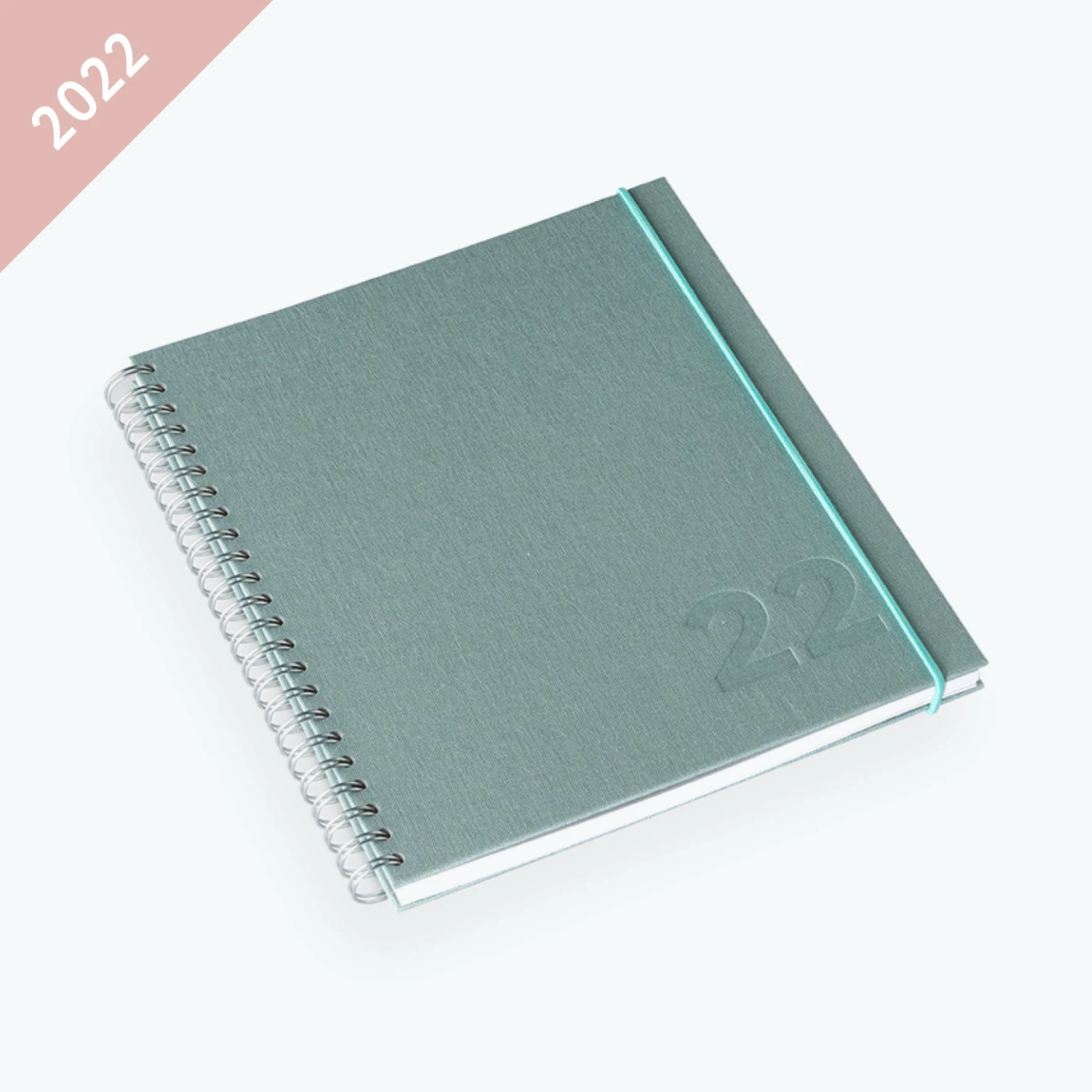 Get organised for 2022 with the dusty green,Β wire-oΒ Bookbinders DesignΒ diary.Β The regular sized,Β hard cover features a week per double page, as well as a monthly overview. The number 22 is blind debossed on the bottom right hand corner, while the elastic closure keeps the diaryΒ shut and a black ribbon makes it easy to bookmark pages.