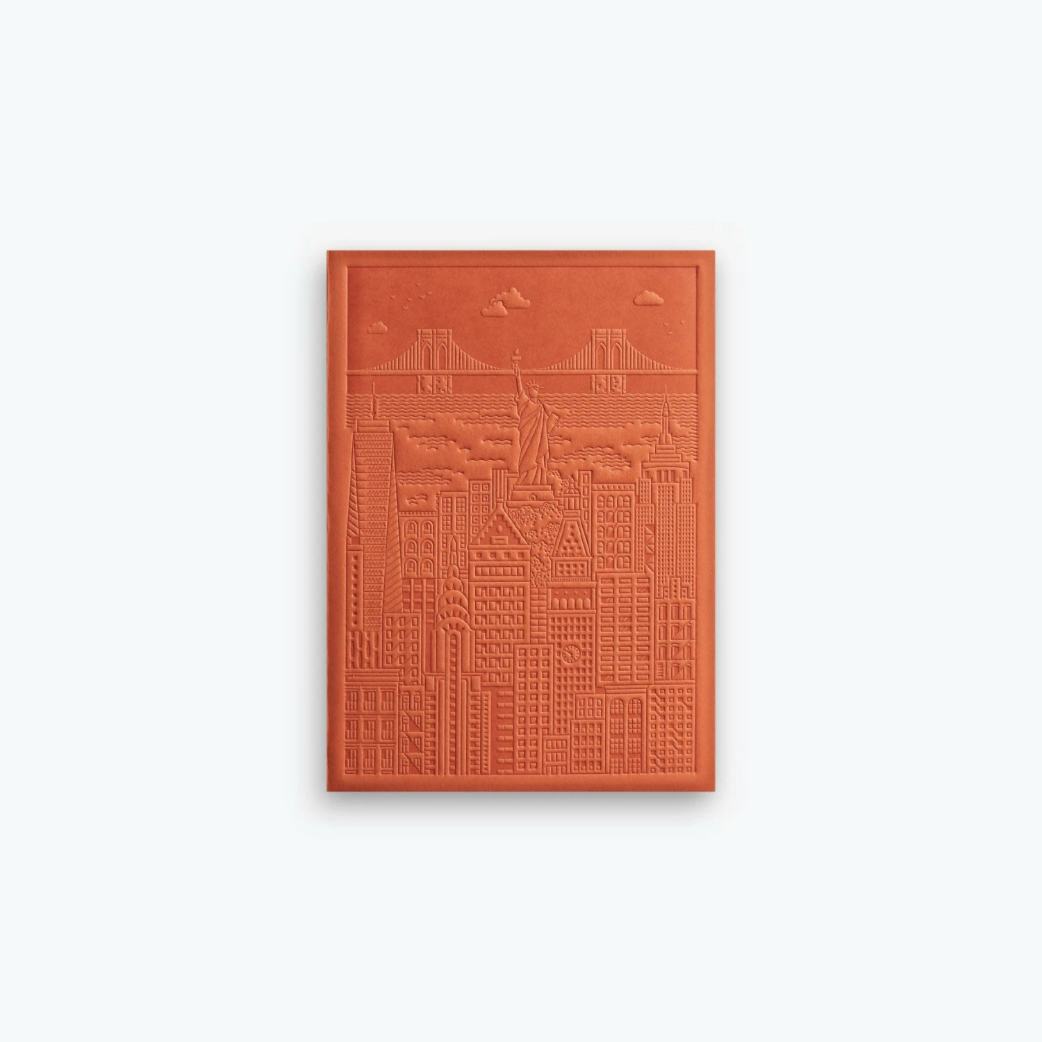 The tall island city of New York is inscribed into this high-quality notebook. The rust cover features iconic landmarks including the Statue of Liberty, Brooklyn Bridge and the Empire State Building – how many can you find?