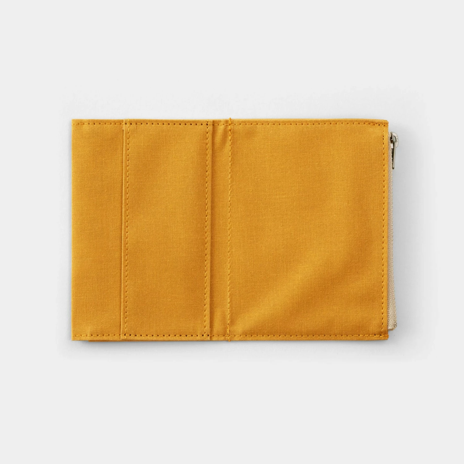 Thisย passportย sized,ย mustard case has a zipper pocket that is perfect for storing money, keys or writing instruments, an envelope-style slip for carrying tickets and postcards and three small pockets for cards.