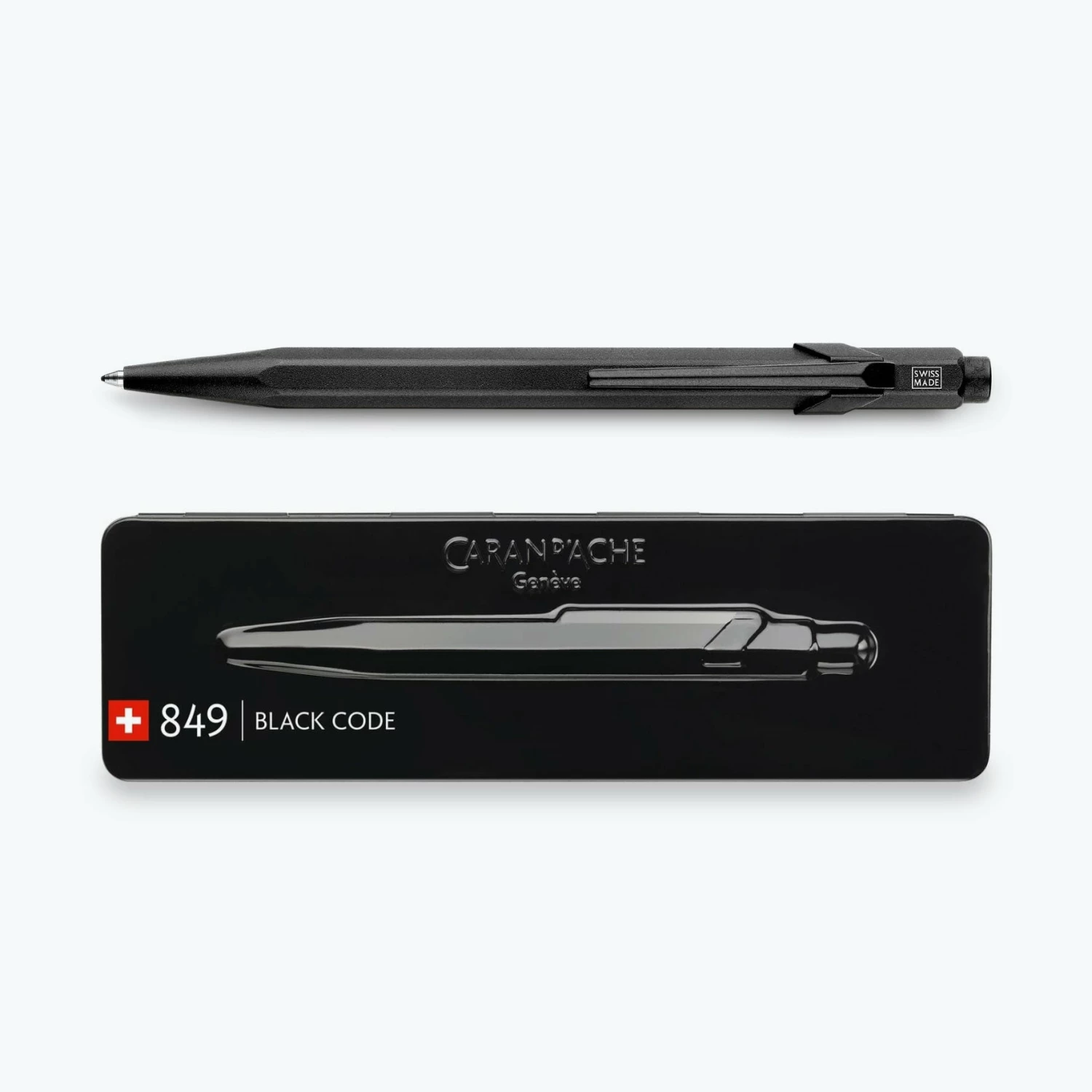 Since 1969, theΒ Caran d’AcheΒ 849Β ballpoint pen has been the ideal day-to-day companion. With its hexagonal shape, aluminium body, flexible clip and push button,Β thisΒ iconic yet contemporary pen guarantees writing comfort. It is 100% Swiss made and comes fitted with the Caran d’Ache mediumΒ blueΒ Goliath ink cartridge, which will last for 8000m of wiring.Β