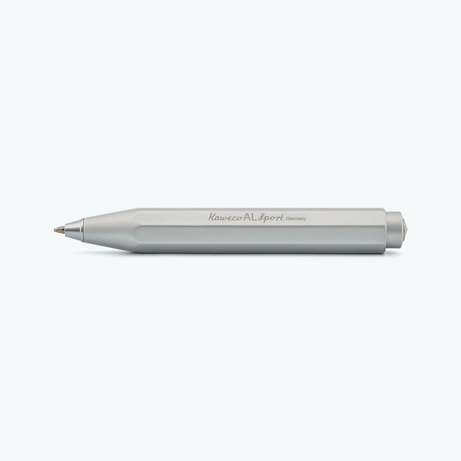 The silverΒ Kaweco AL Sport ballpoint pen balances a sporty look with superior quality.Β ItΒ closely follows the original octagonal design, which is very compact at just 10.3cm, making it easy to carry around and comfortable to write with. It is made from high-grade aluminium and features a silver metal Kaweco logo on the top of each push button, which uses a retractable mechanism.