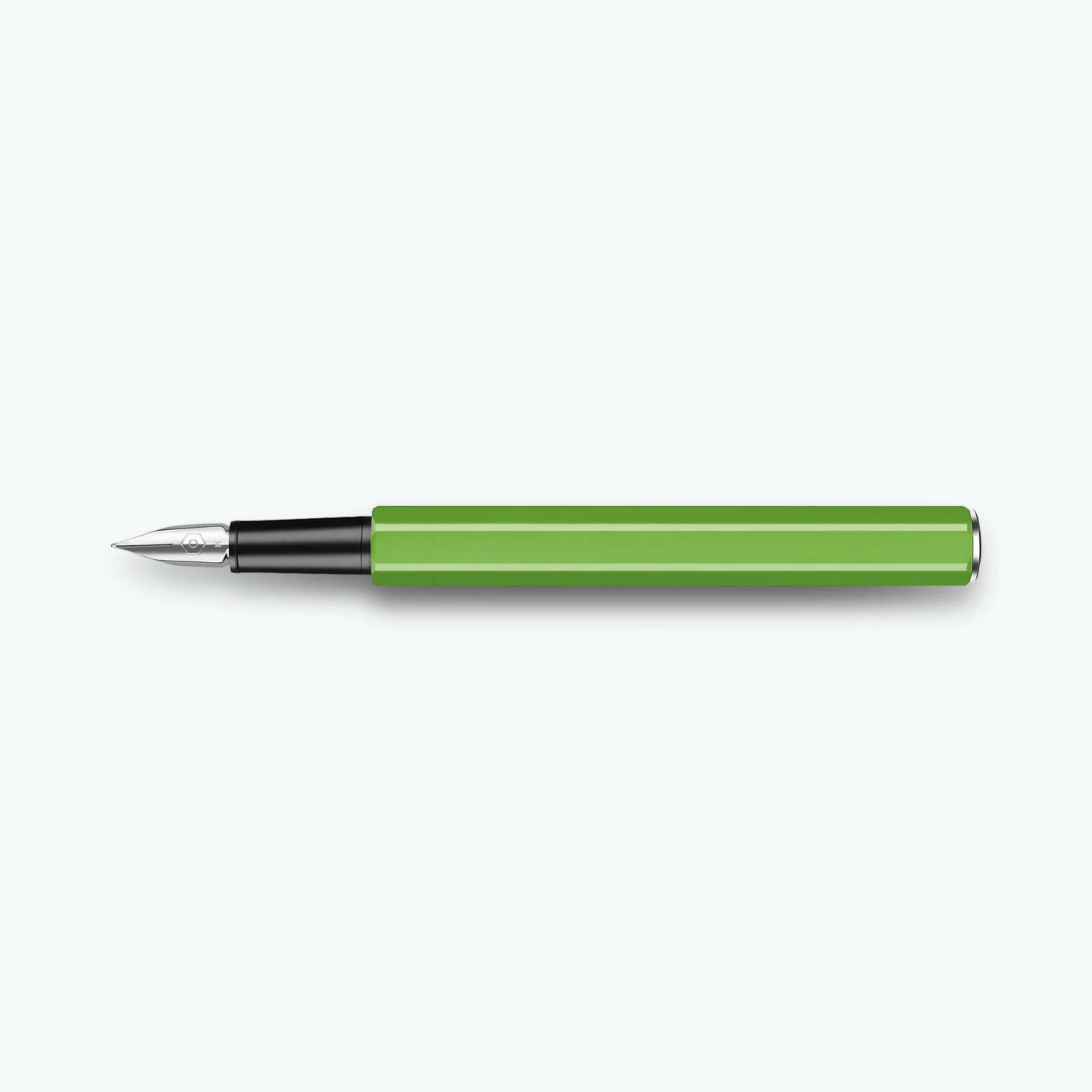 The fluo green Caran d’Ache 849 fountain pen is a contemporary take on a traditional writing instrument. It is Swiss made and features a hexagonal, lightweight yet robust aluminium body with a click in cap, with the Caran d’Ache isotype engraved on the button.