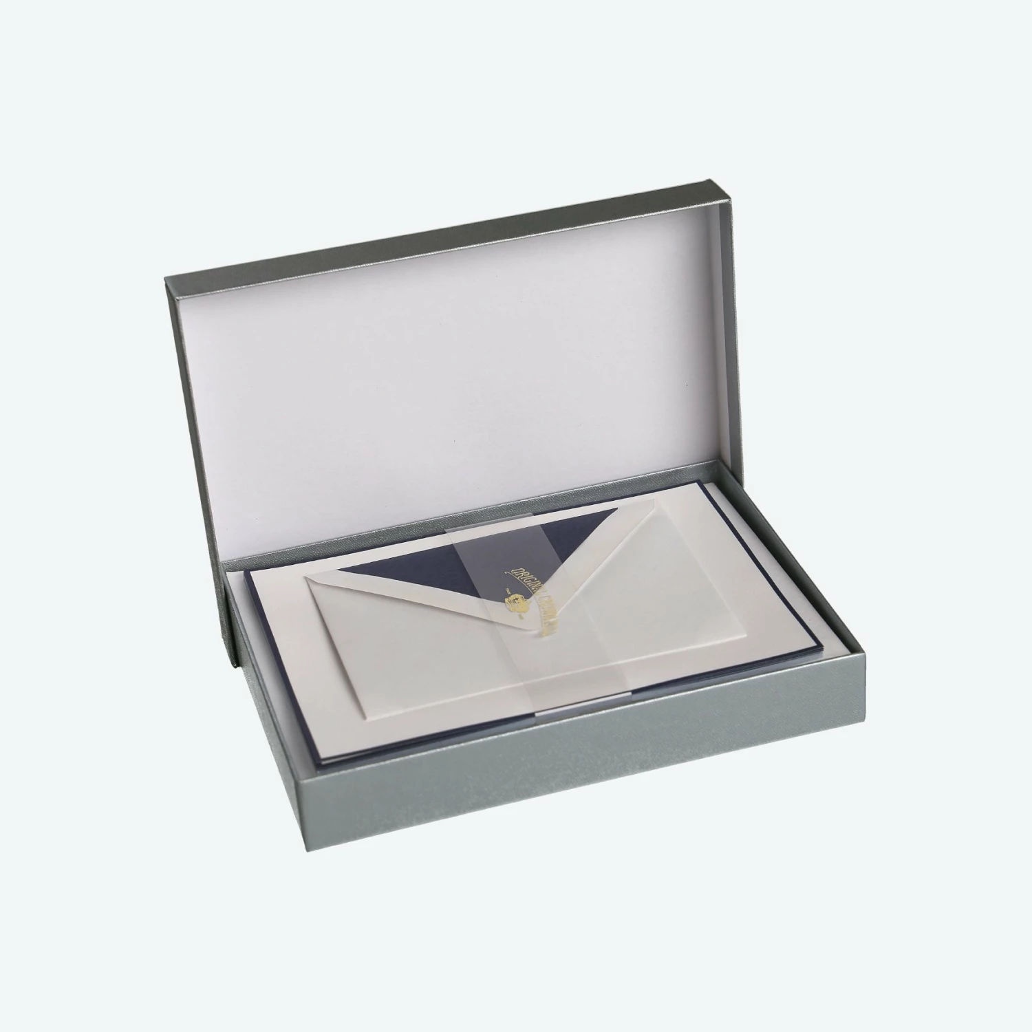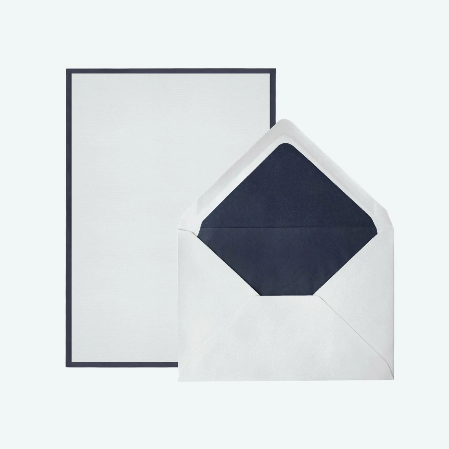 Made in Belgium. thisΒ Crown MillΒ letter set includes 25 flat sheets of white, laid paper with aΒ navyΒ border and 25 matching C6 envelopes that are tissue lined. The set comes in a sturdy,Β silver presentation box.Β