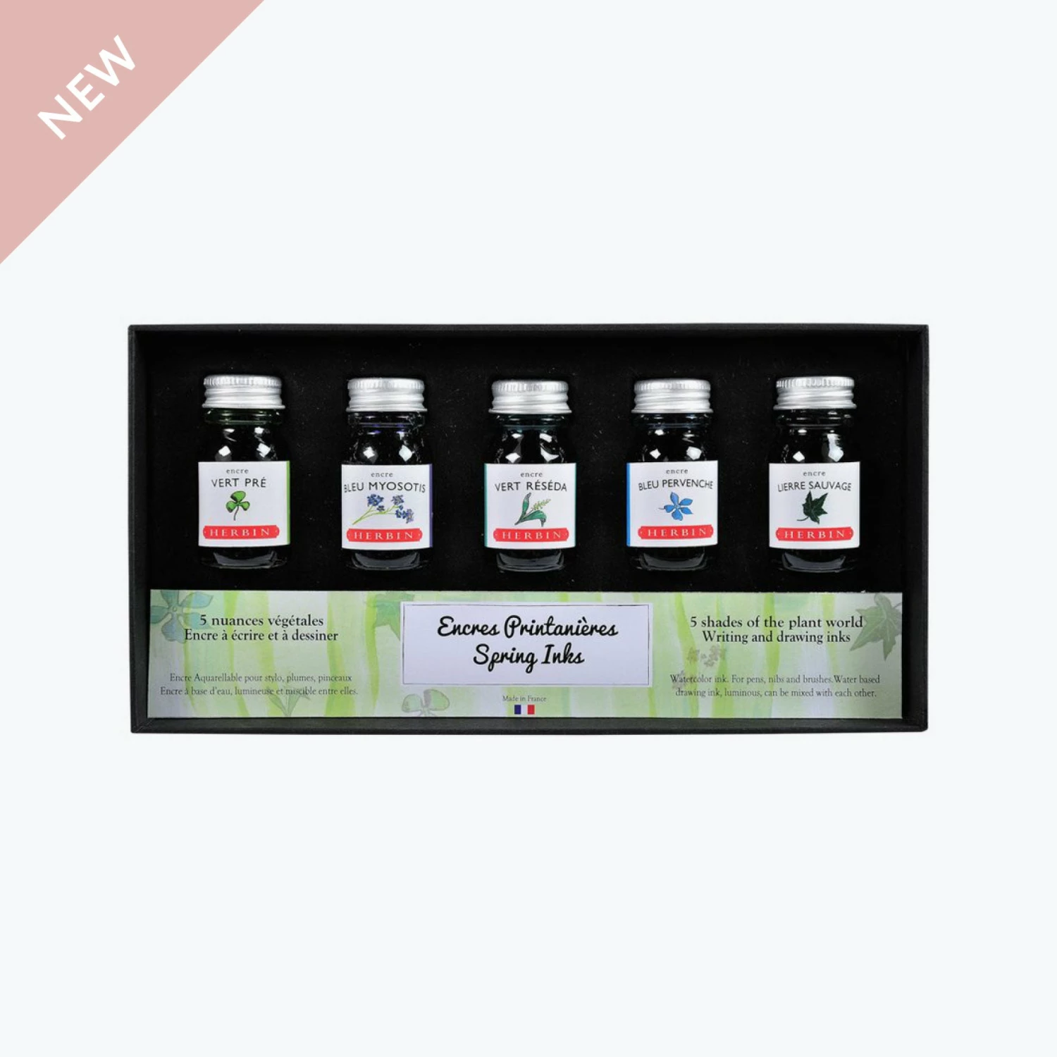 Inspired by the colours of the seasons, theΒ HerbinΒ springΒ set features 5 bottles of watercolour fountain pen inks.Β It is a smooth flowing, water-based inkΒ madeΒ using natural dyes in France, resulting in a neutral pH level and making it suitable for both modern and vintxage fountain pens.