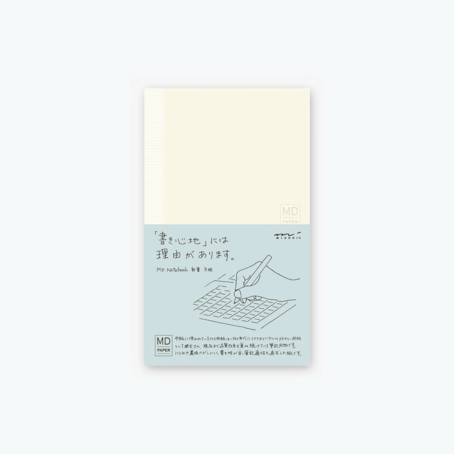 The grid notebook has 5mm squares with gaps in between, like the old genko yoshi used for writing in Japan. Every 5 and 10 squares are marked, making it easy to count how many characters are written, and the lines of the grid are pale blue so that theyย doย not interfere with writing or sketches.