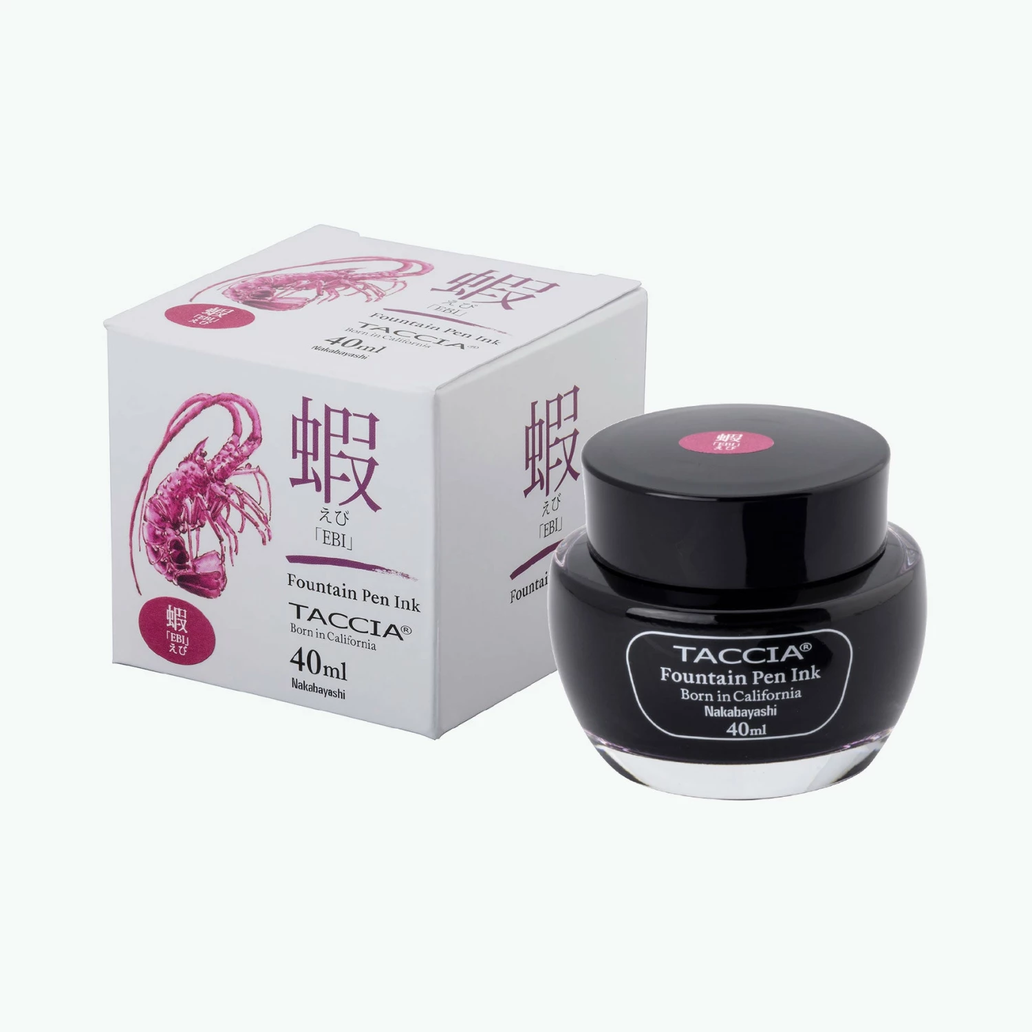 Tacciaย ebi (purple red) fountain pen ink is made in Japan and inspired by the Japanese way of seeing colours in a very pure, honest, and innocent way. It is a water-soluble, dye ink with rich expression and a balance of permeability and viscosity so that it flows nicely on paper. It is carefully formulated with a neutral pH to avoid any damage to the pen nib. Taccia ink comes in a 40mL bottle and the packaging is designed by Japanese fountain pen illustrator, Hiroshi Sato.