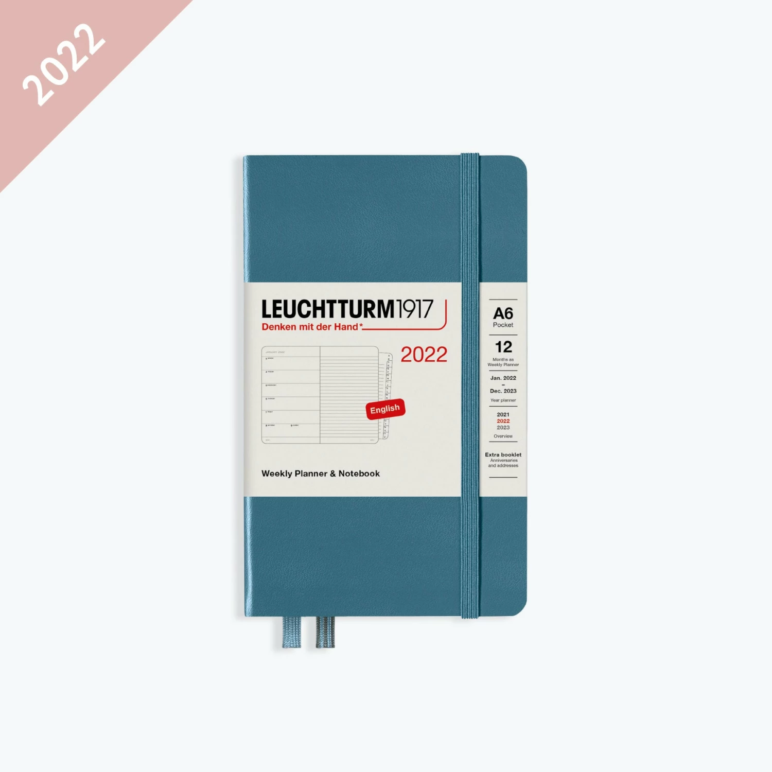The A6Β stone blueΒ Leuchtturm1917Β weeklyΒ notebookΒ diary is a simple yet functionalΒ companion for 2022.Β Every page features the calendar week on the left and a ruled notebook page on the right.Β