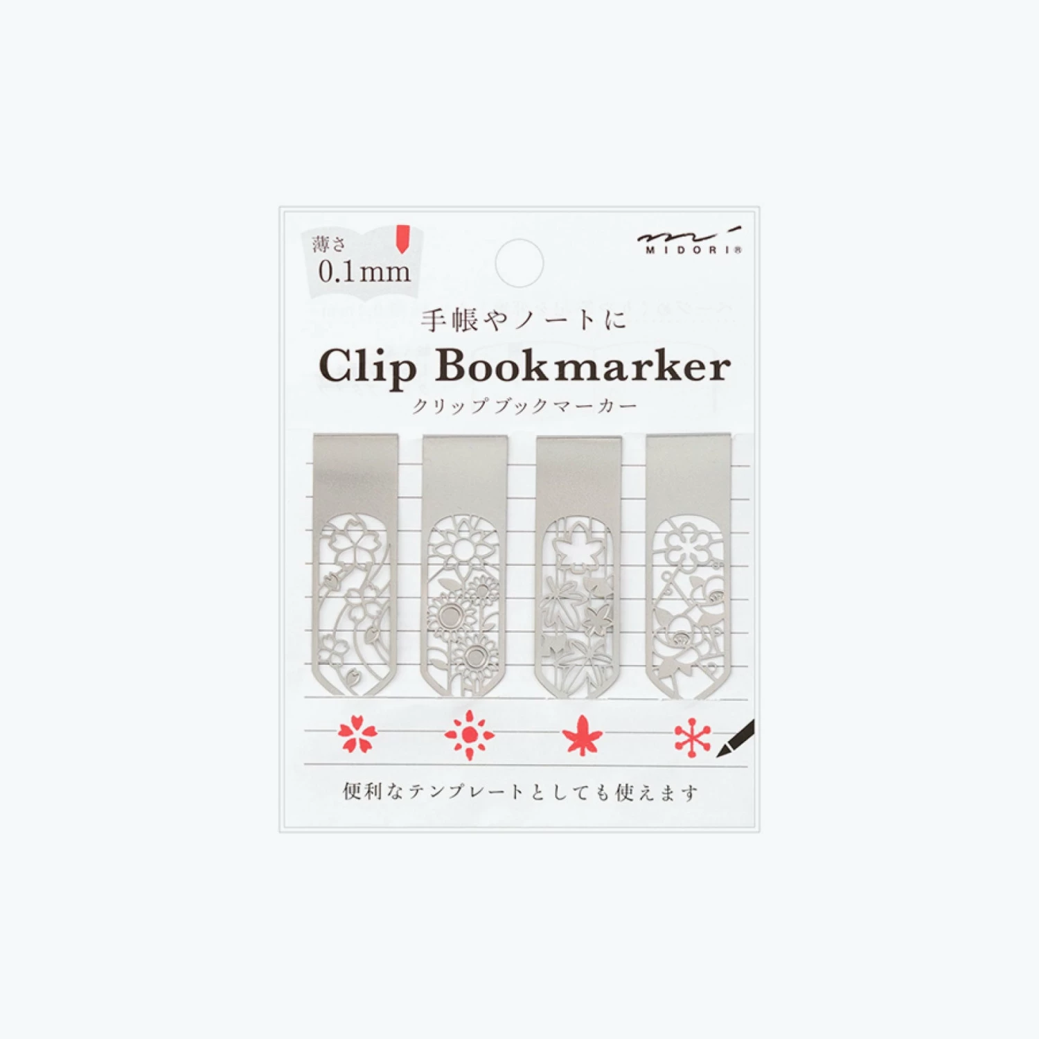 With a thickness of only 0.7mm, these very slimΒ MidoriΒ Clips mark the pages in your books without leaving any indentations. They areΒ made from stainless steel and die-cut withΒ various flowerΒ outlinesΒ that are suitable to use asΒ aΒ stencil – simply colour them in to decorate your pages.