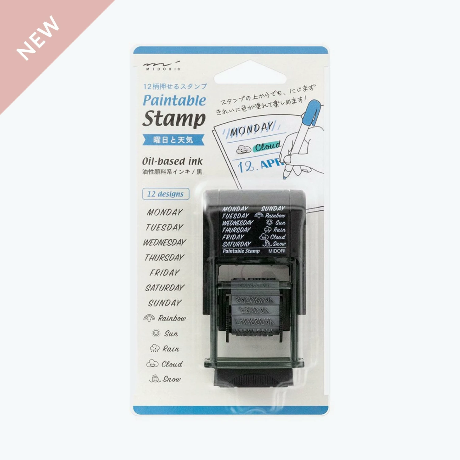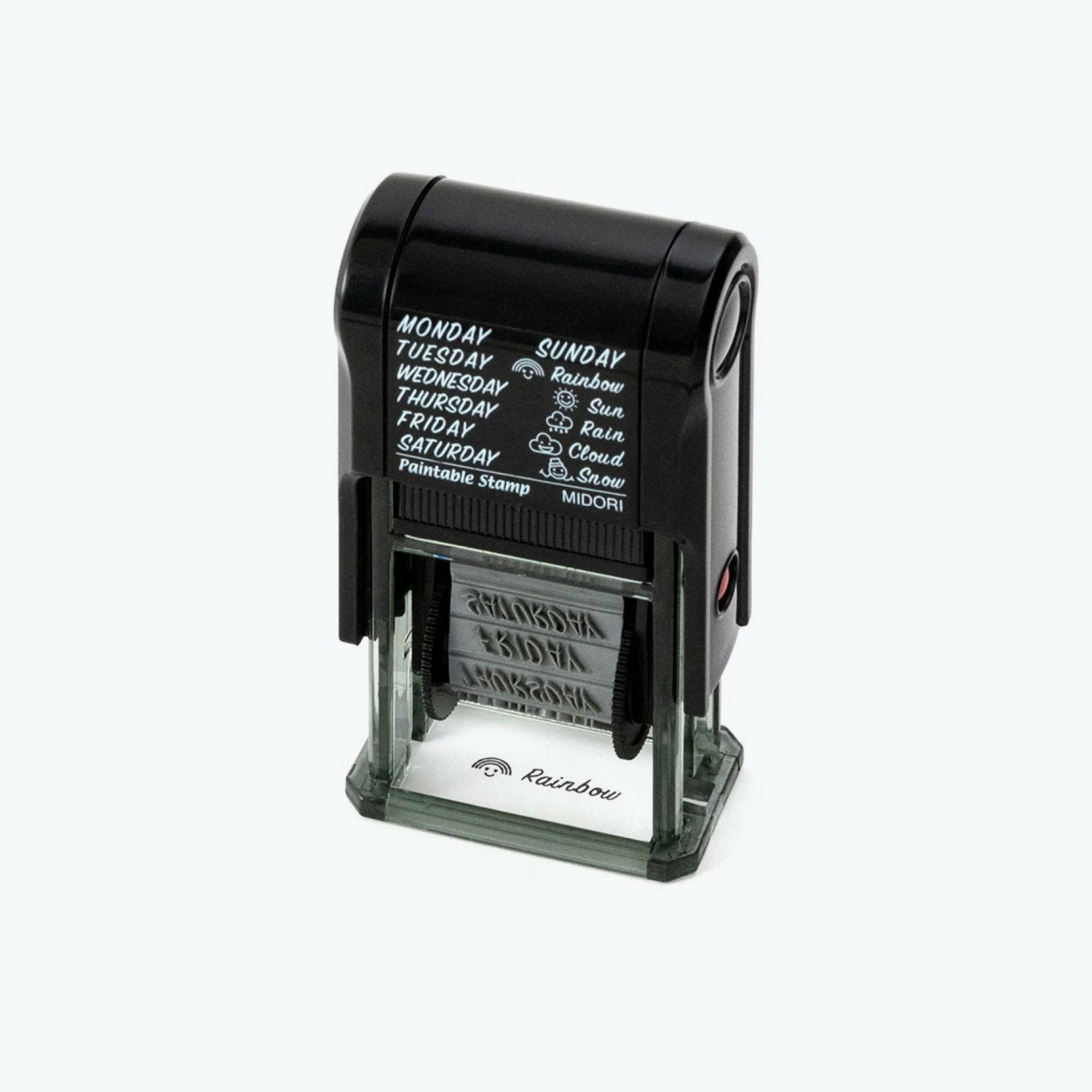 The Midori days rotating stamp features 12 designs including the days of the week and weather. To use, simply rotate to the desired design and press down on the page. The stamp can be used 2,000 times and when the ink runs out, it can be topped up using the Midori ink refill.